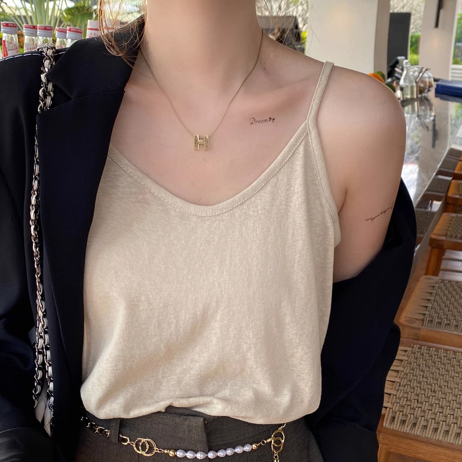 拉夏贝尔咖色V领宽松吊带背心女内搭2025夏新款棉麻外穿打底上衣