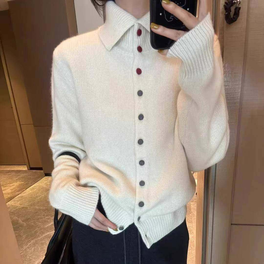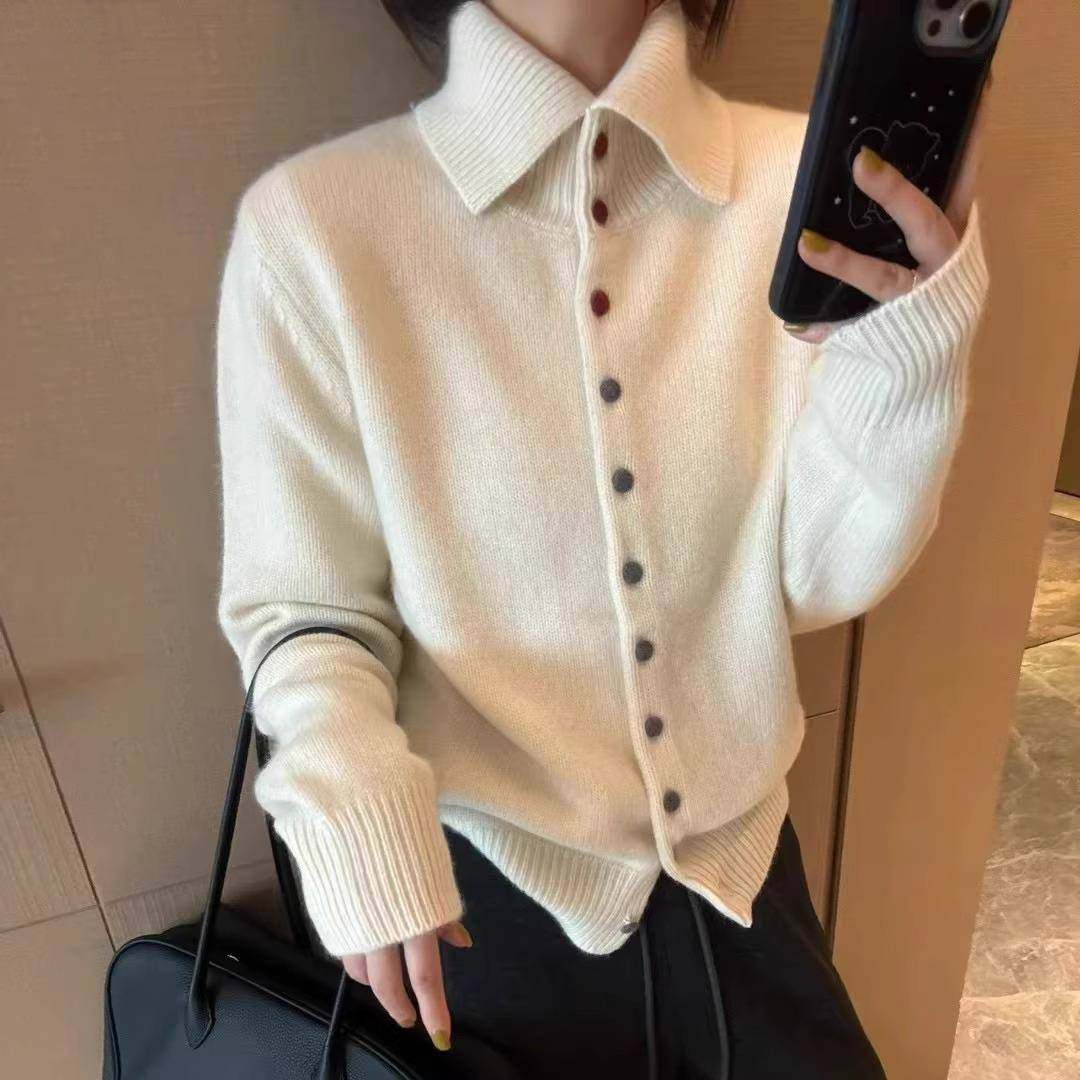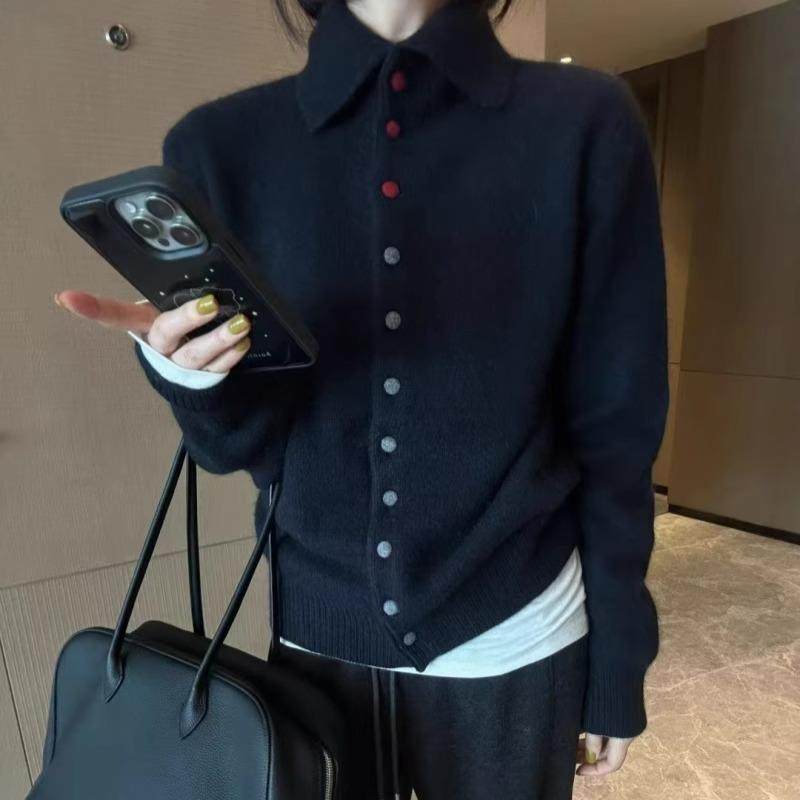 复古灰色高领毛衣开衫女秋冬彩色单排扣设计感翻领羊毛衫针织上衣
