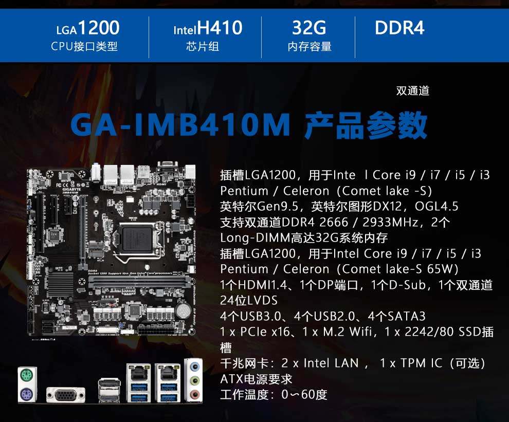 技嘉工控主板IMB410M双网6个com/DP/HDMI/VGA/PCIe/PCI支持i9/4K