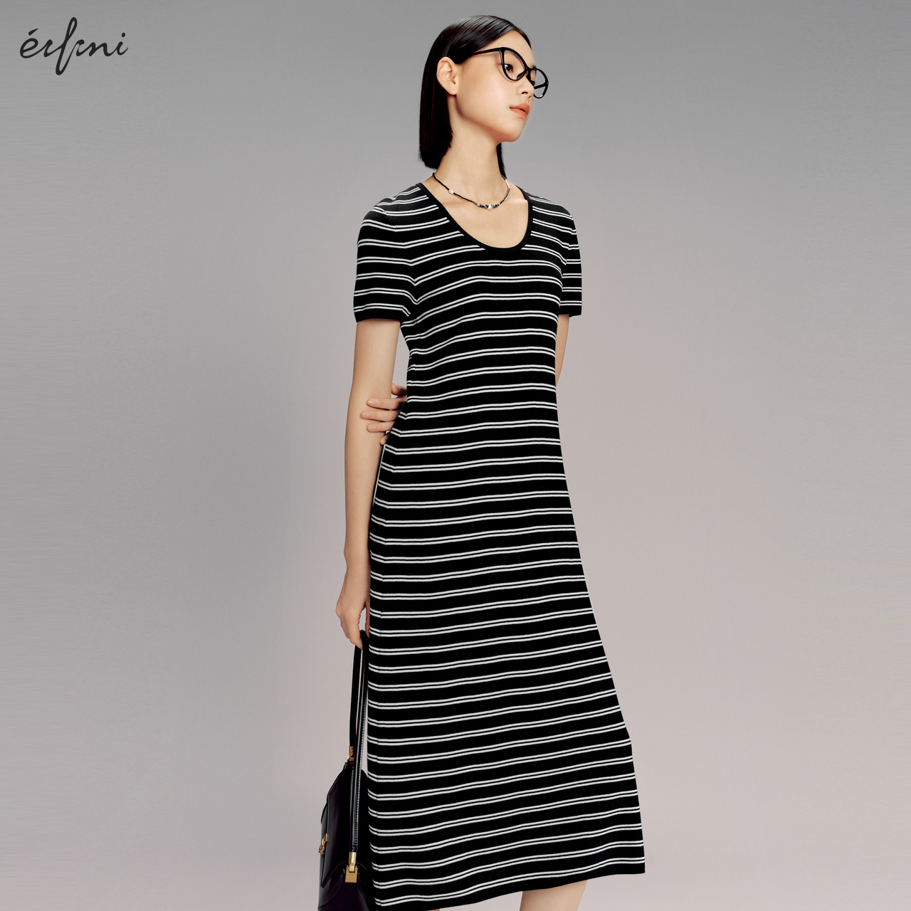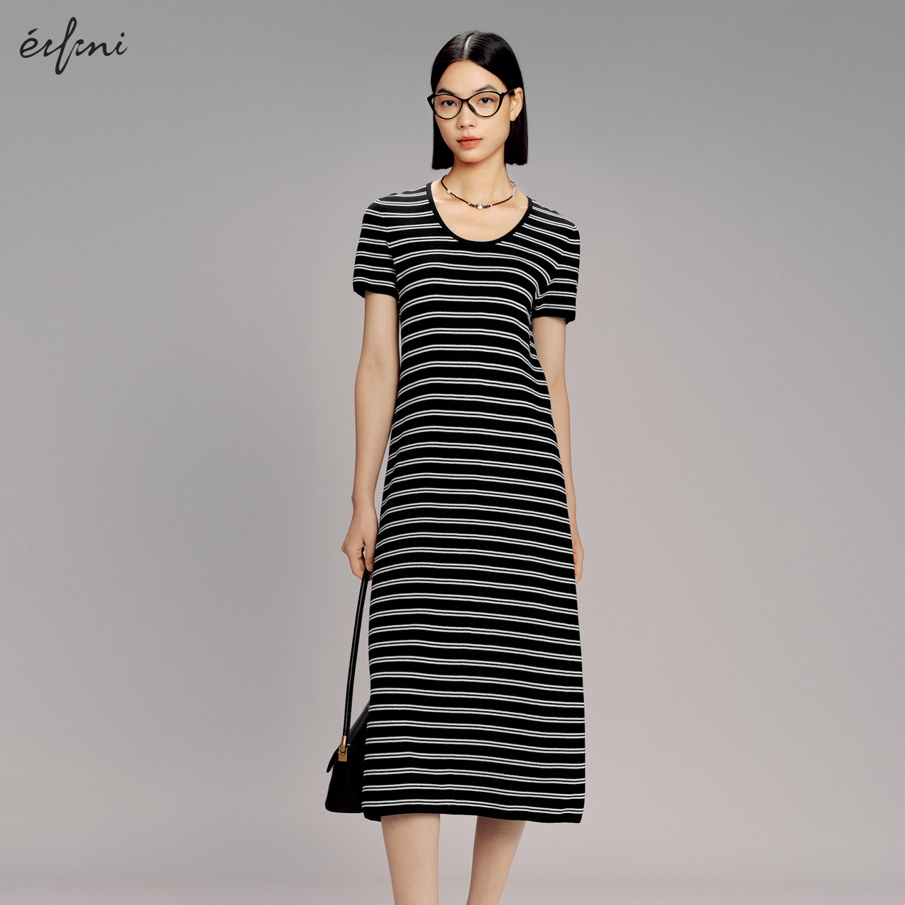 伊芙丽outlets店莫代尔混纺圆领条纹长款短袖连衣裙春夏T恤裙女