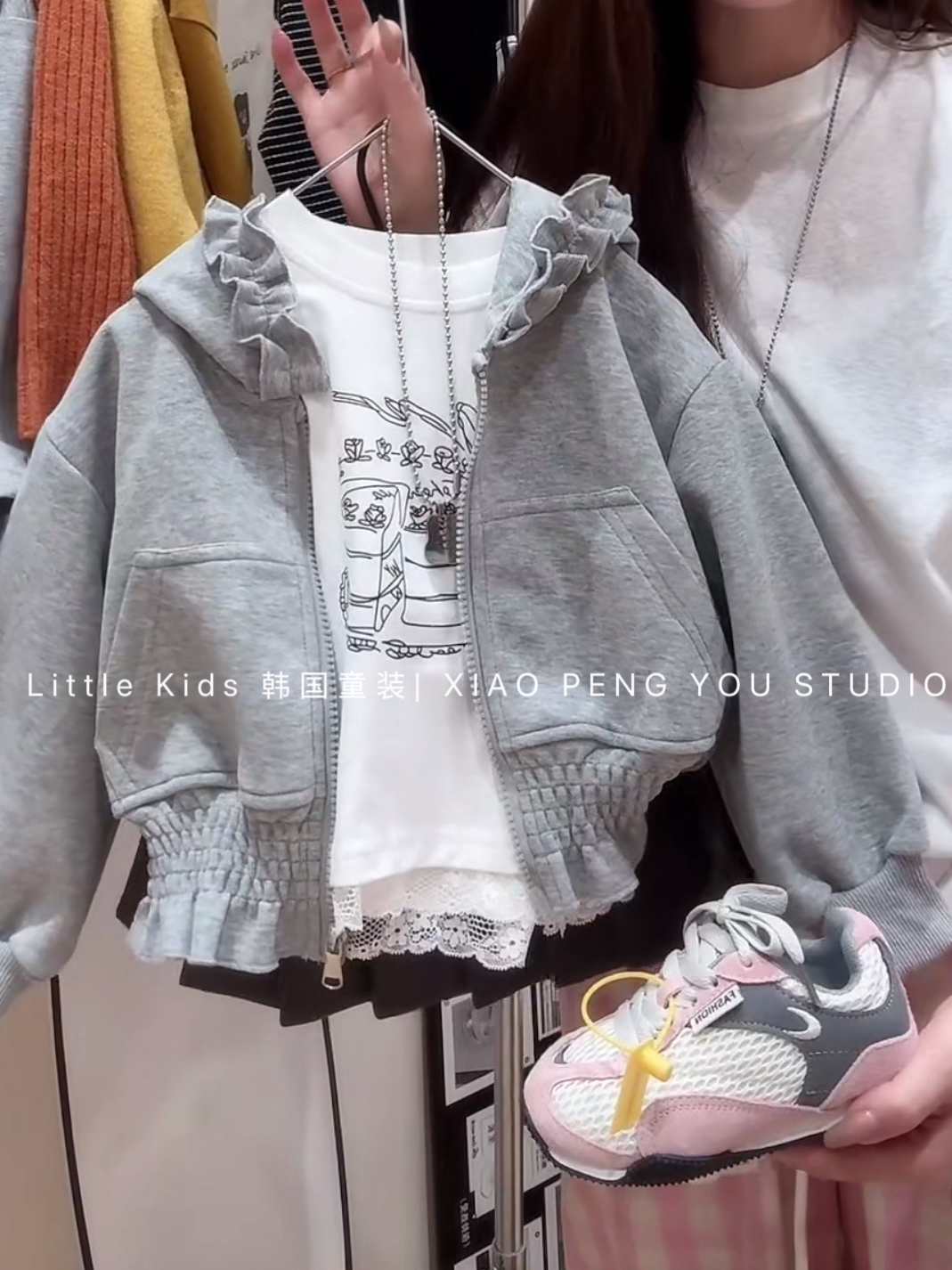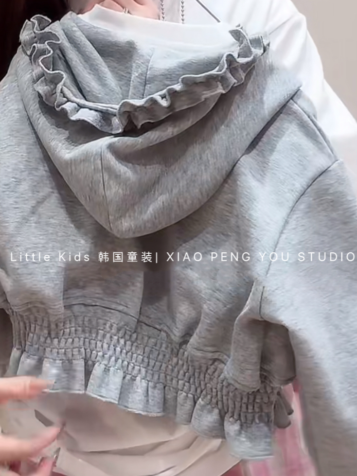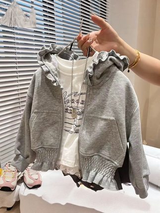 儿童连帽外套秋装2025女童休闲拉链带帽卫衣 花边收腰miu系短开衫