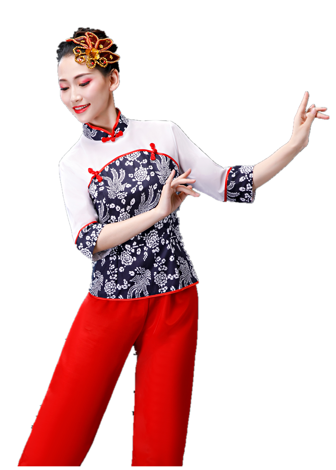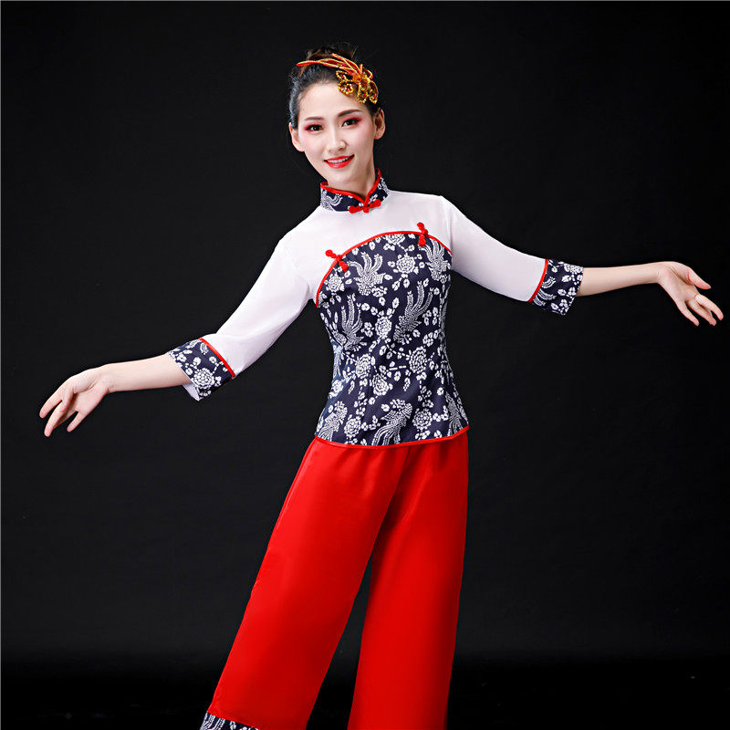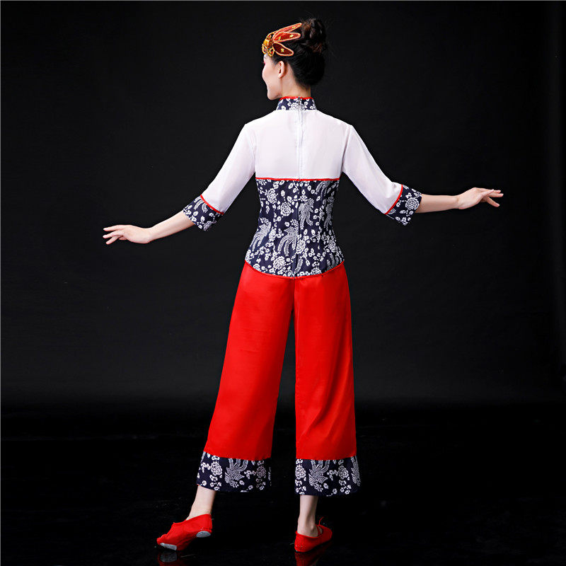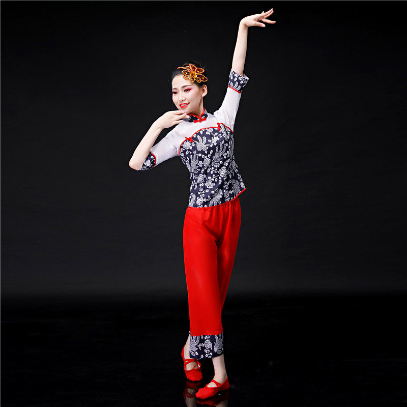 2024秧歌舞蹈服装演出服表演喜庆广场舞斗笠舞采茶村姑衣服女碎花