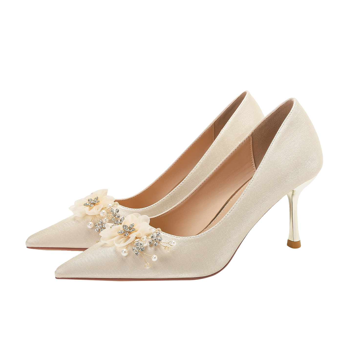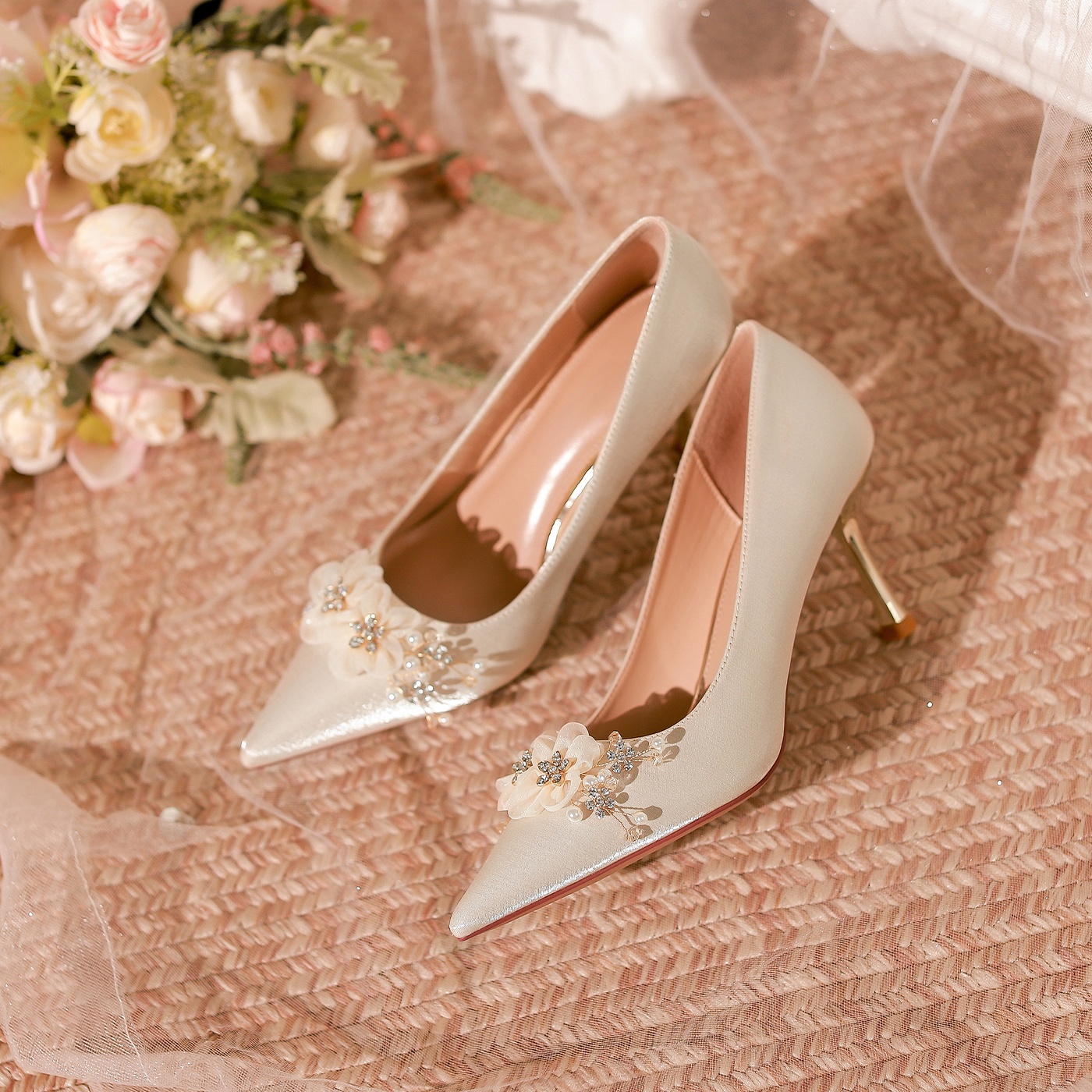 法式结婚鞋女秀禾婚纱两穿新娘鞋香槟色不累脚尖头绝美绸缎高跟鞋