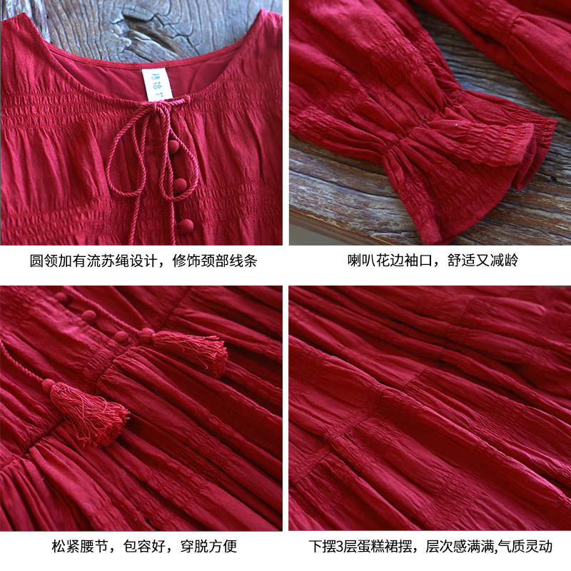 7折【山光黛浮】圆领抽褶连衣裙女春季红色浪漫减龄大裙摆蛋糕裙