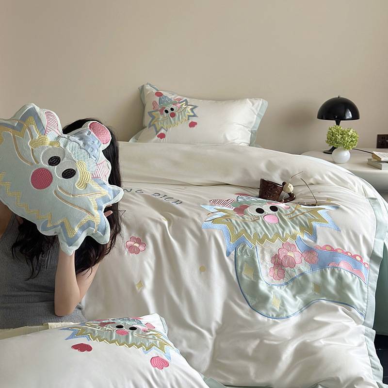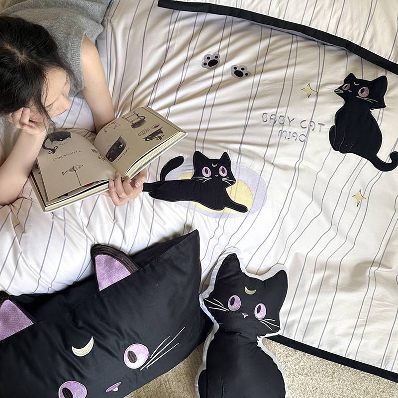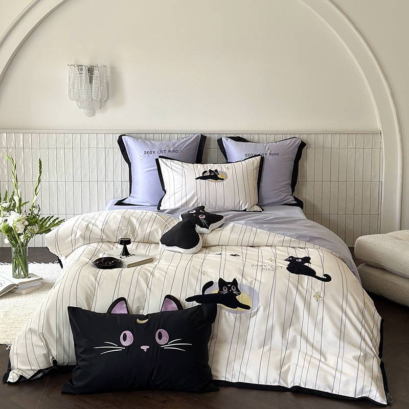 少女心可爱卡通猫咪刺绣100支全棉四件套贡缎长绒棉被套床上用品