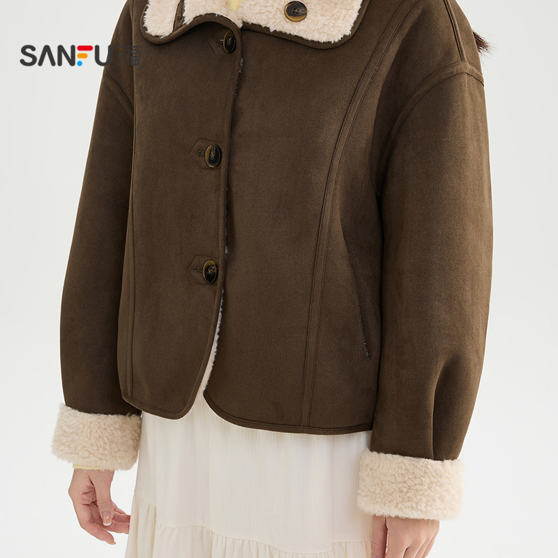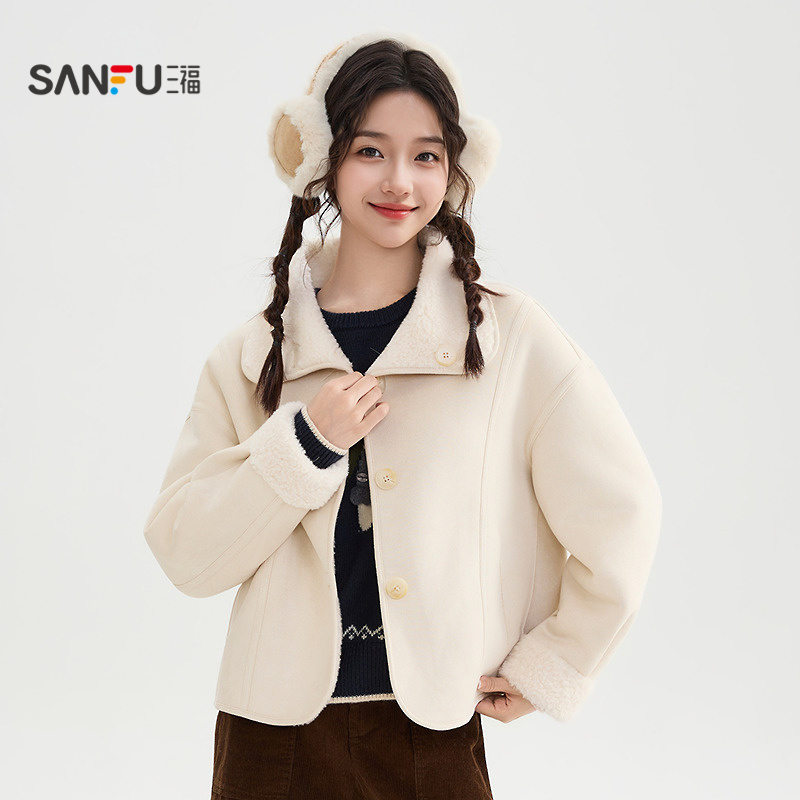 三福厚外套女2025新款冬季时尚翻领皮毛一体两面穿上衣女装848684