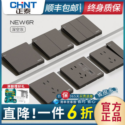 正泰开关插座面板家用86型16a斜5孔黑色墙壁式暗装多孔一开五孔6r