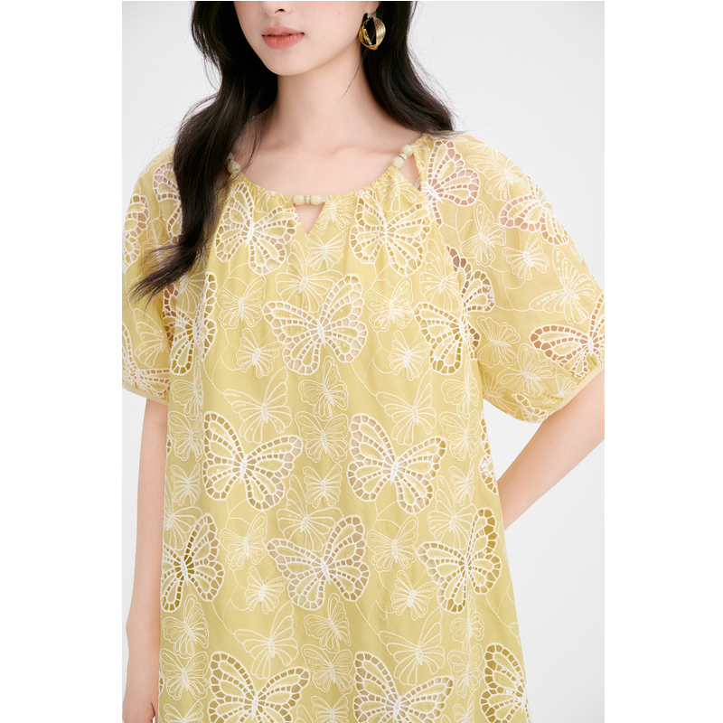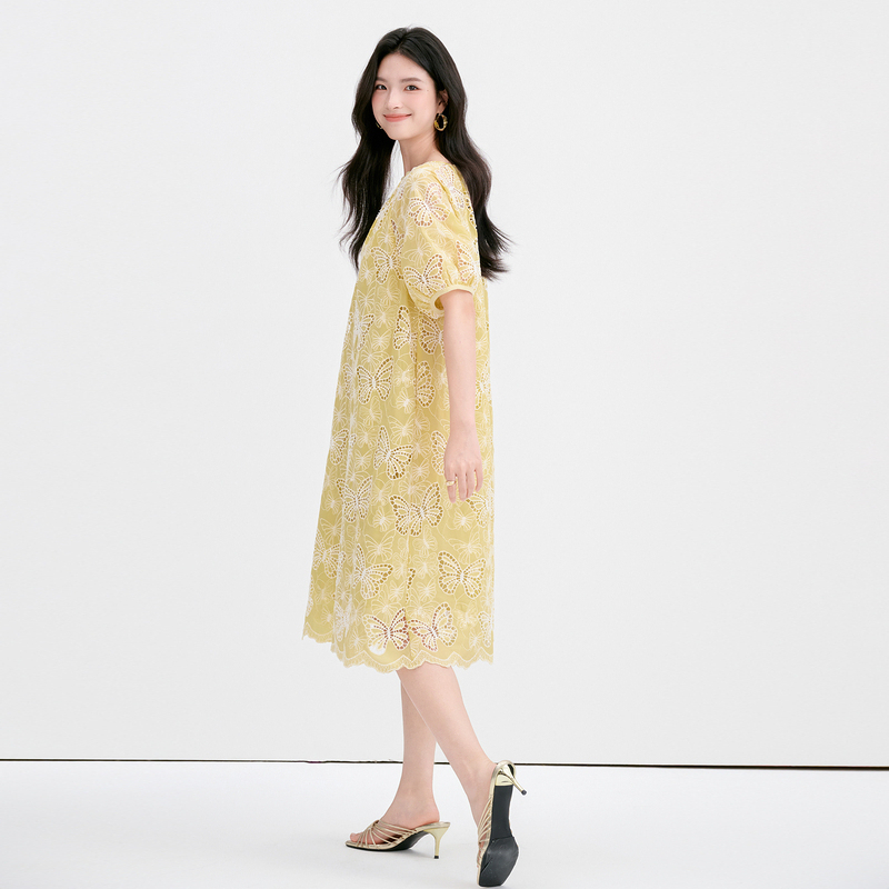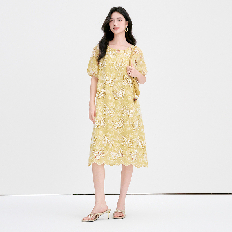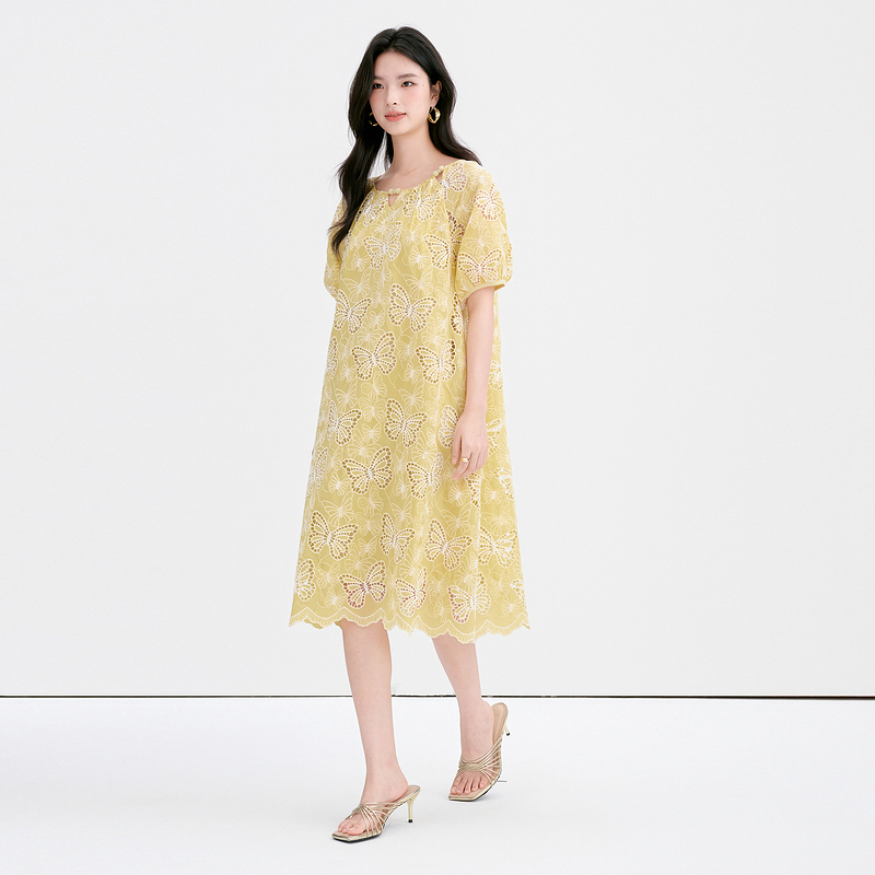 Basic House/百家好提花镂空连衣裙女夏季新款透气泡泡袖中长裙子