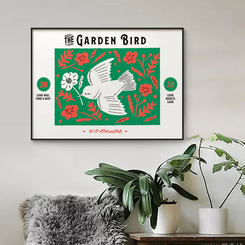 巴塞罗那风格复古小众绿色小鸟文艺简约装饰画芯艺术海报无框画