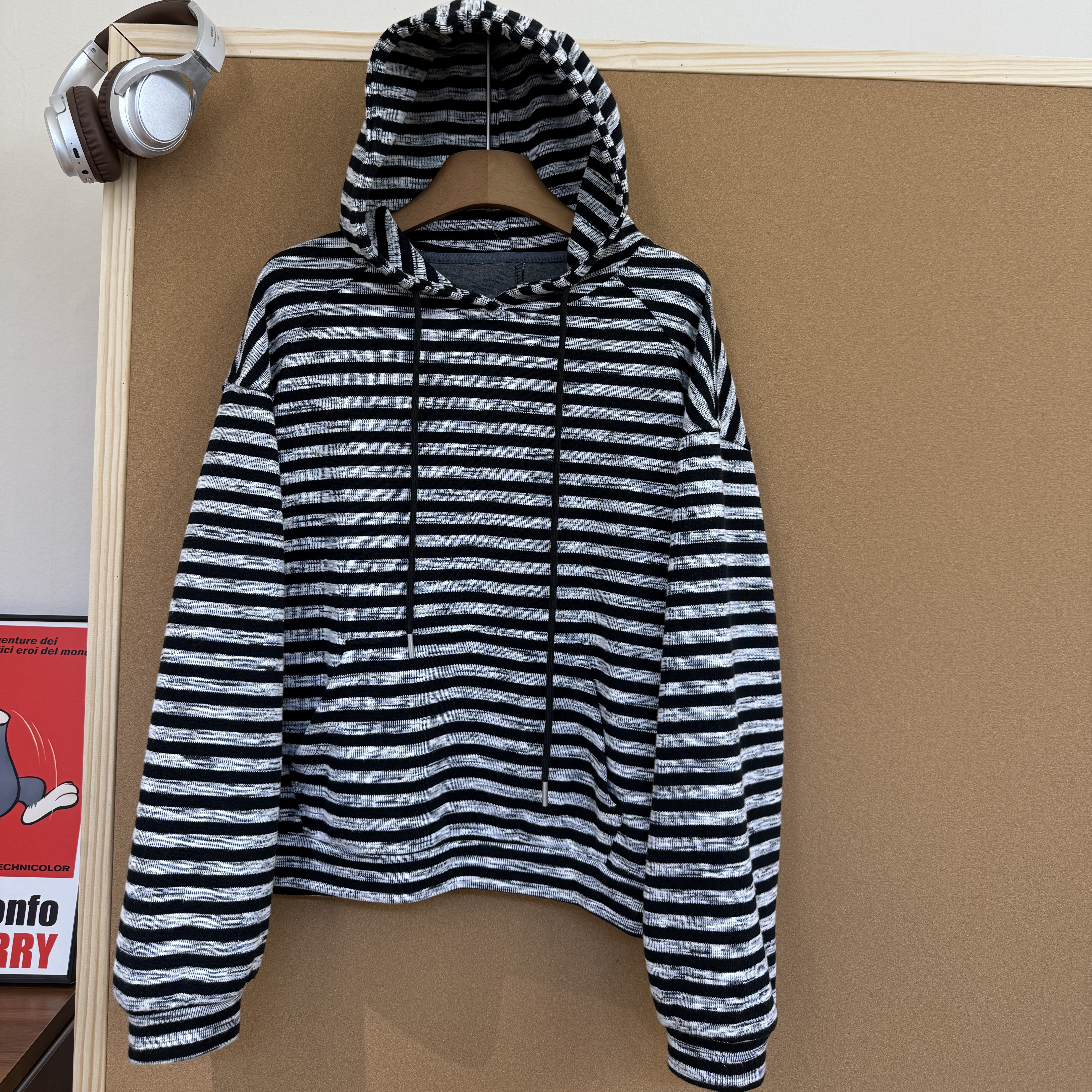 韩版时尚百搭宽松休闲小众连帽条纹长袖打底衫上衣