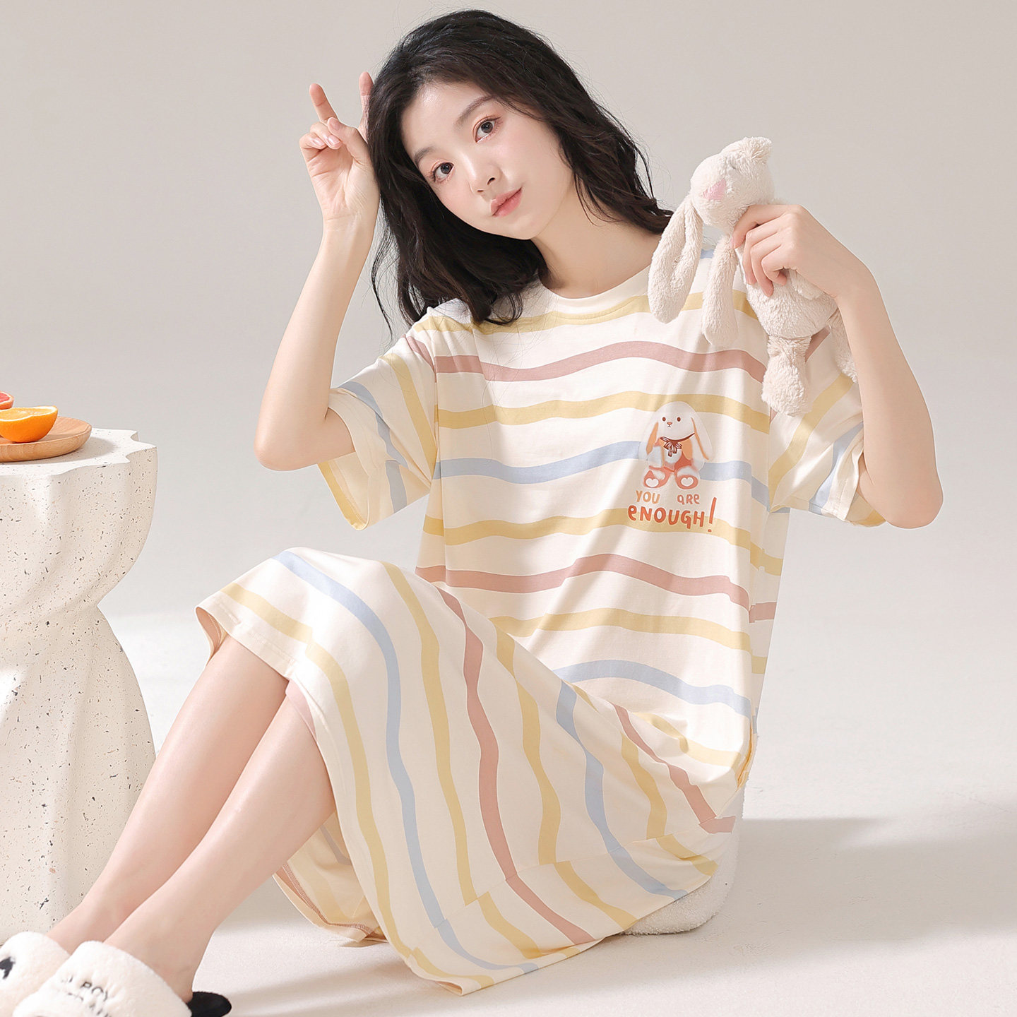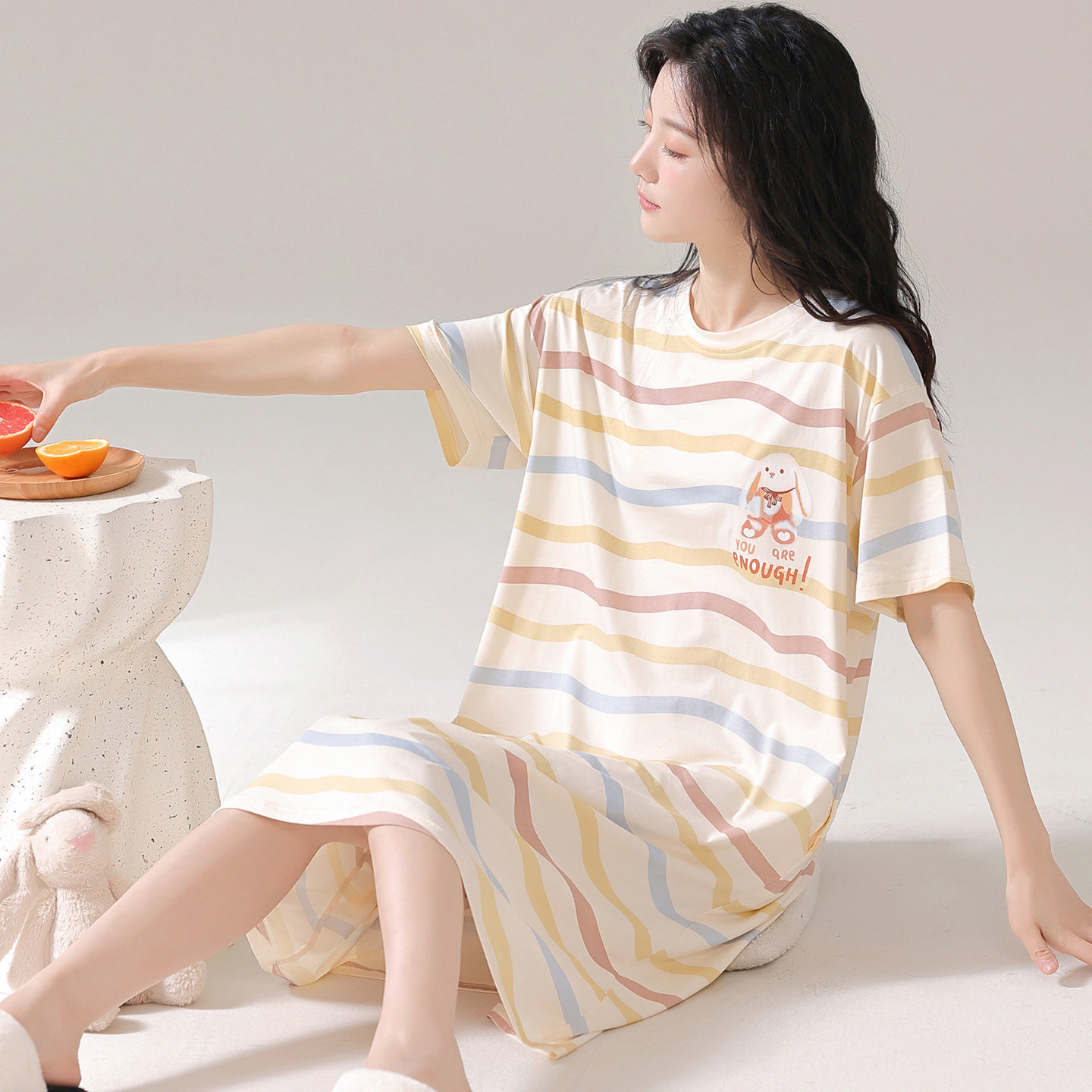 宜而爽夏天新款条纹短袖中长款睡裙女士透气薄款舒适可外穿连衣裙