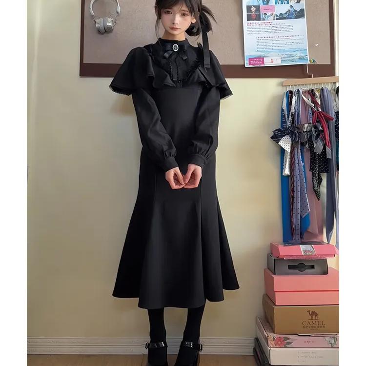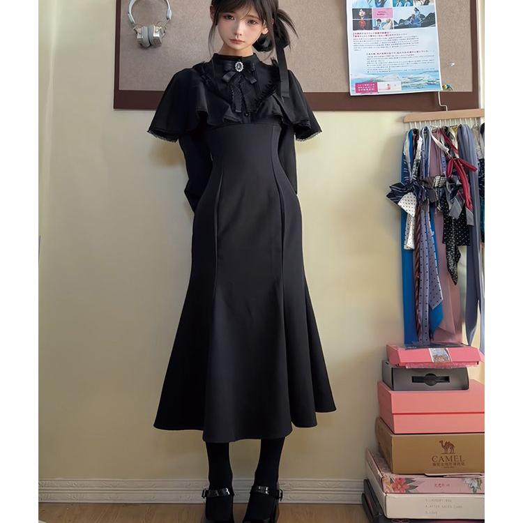 法式赫本风黑色斗篷连衣裙女春季2025新款高级感收腰包臀鱼尾长裙