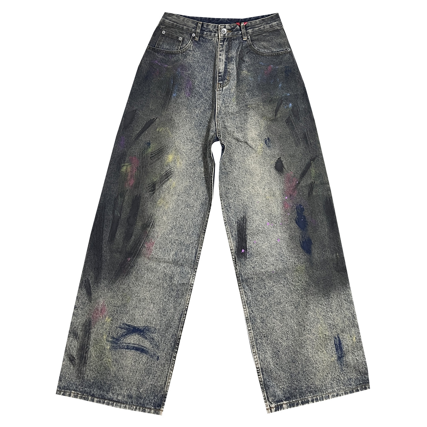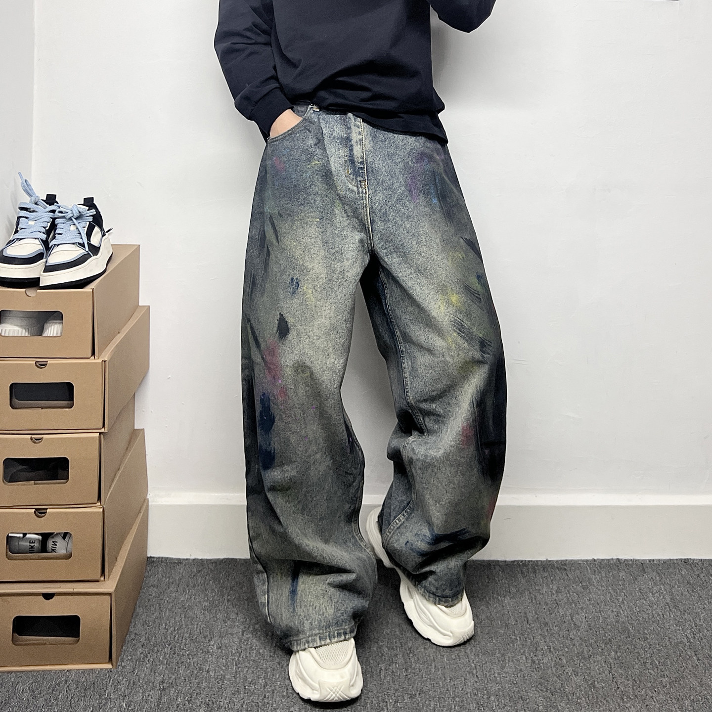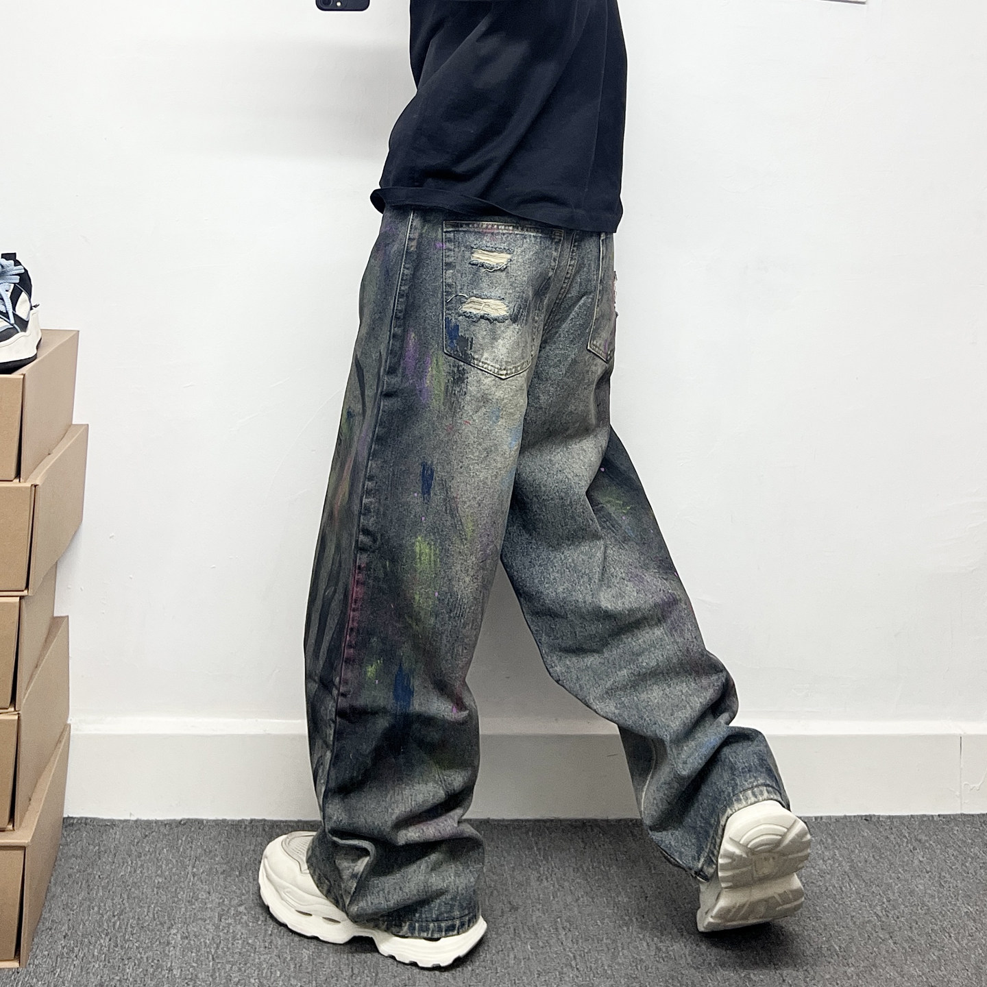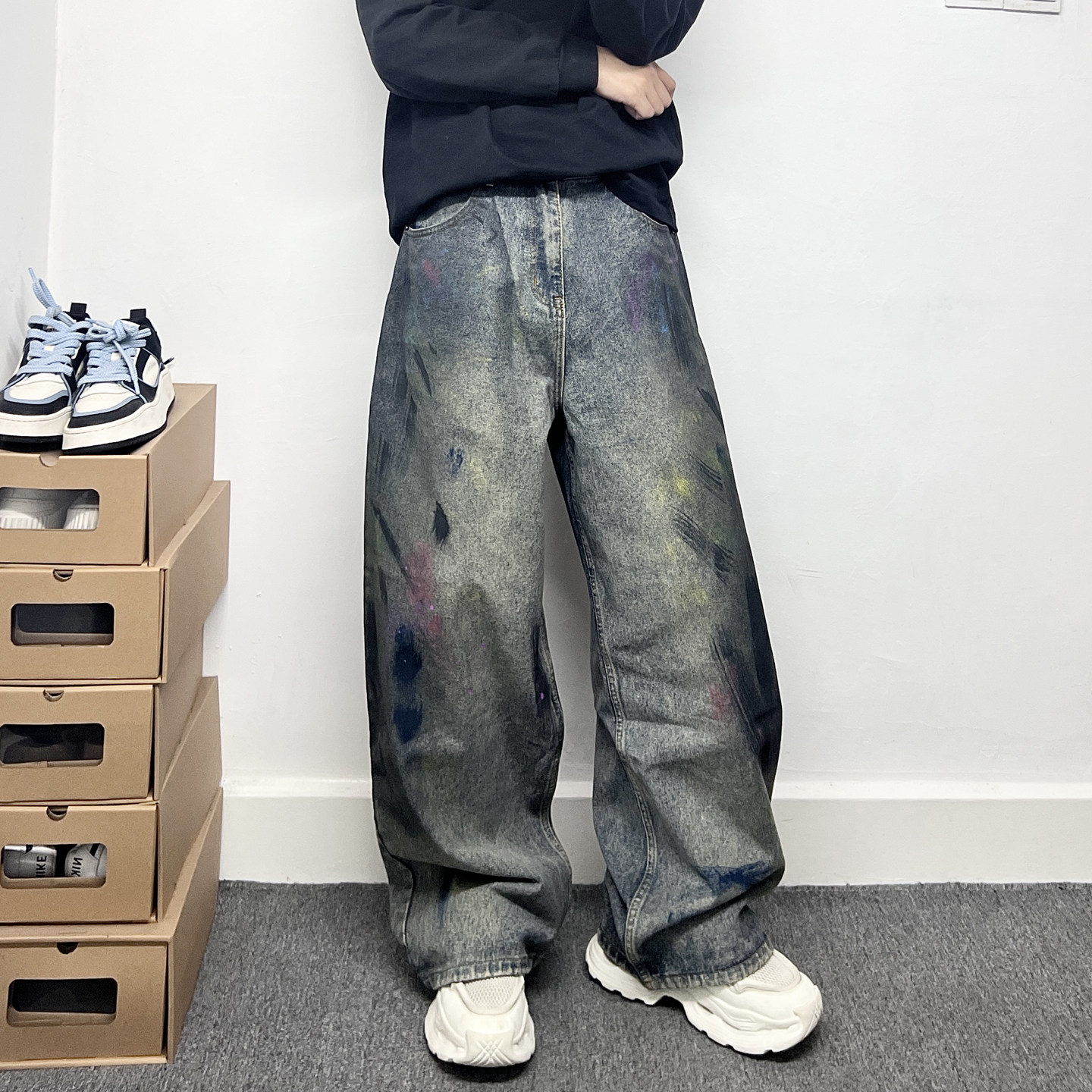 美式休闲复古长裤子男水洗做旧废土风设计感泼墨涂鸦阔腿牛仔裤男