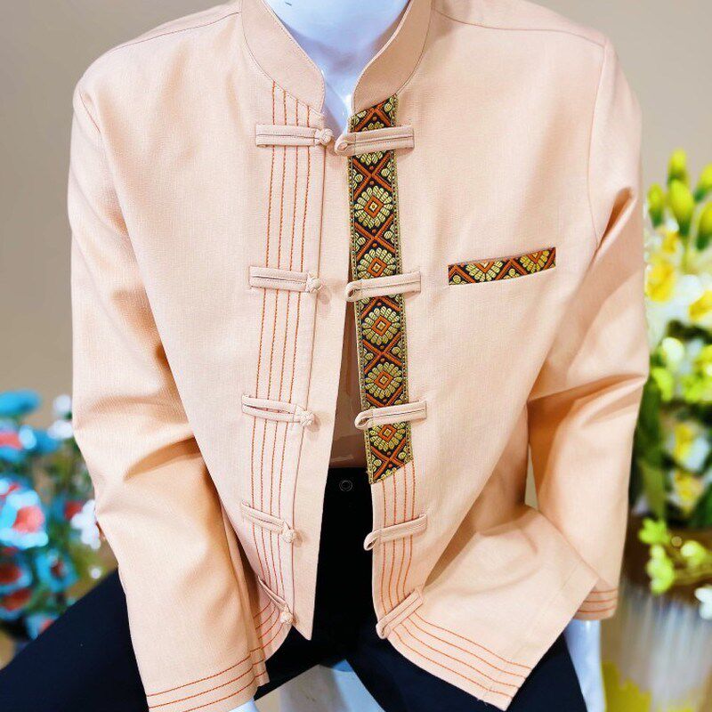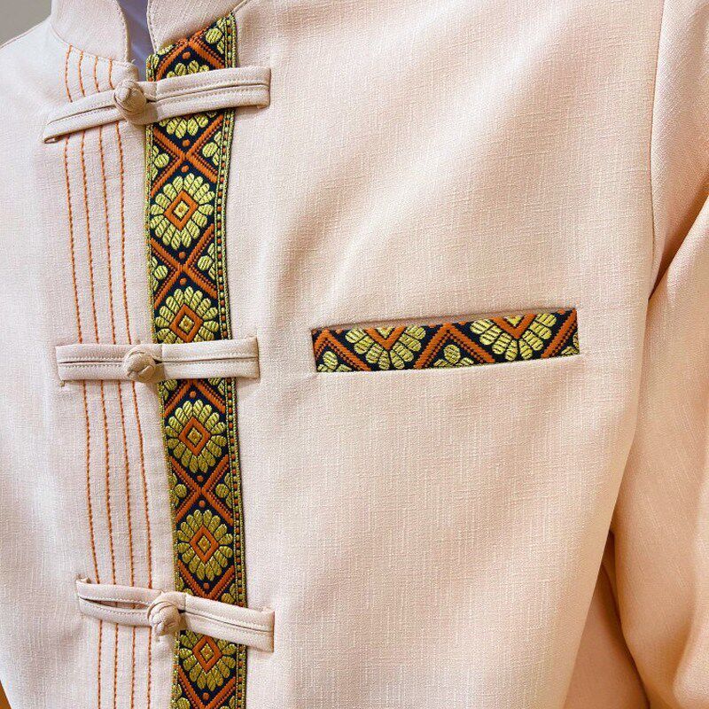 傣族男装立领盘扣浅橘色民族特色衬衣春秋冬长袖款男士衬衫