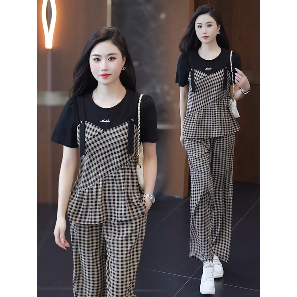 时尚套装女2025夏季新款洋气遮肉显瘦格纹假两件上衣阔腿裤两件套