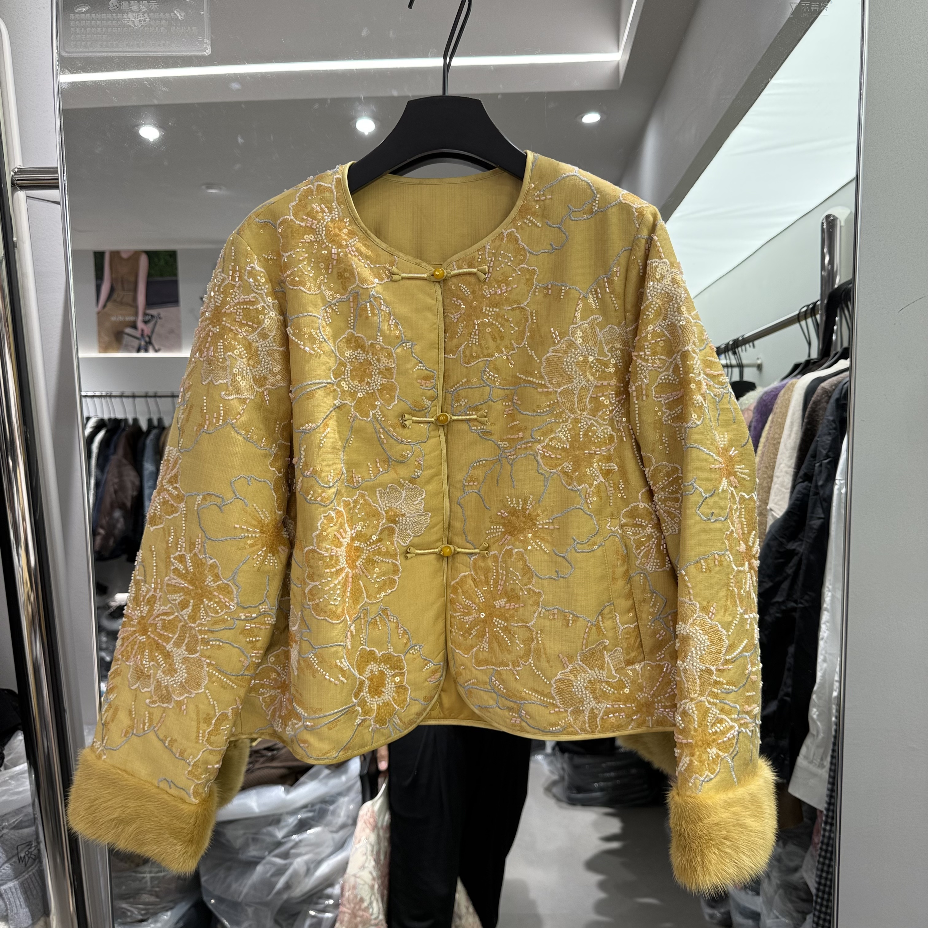 欧洲站2025秋冬款新中式圆领重工亮片绣花水貂毛复古唐装外套6500