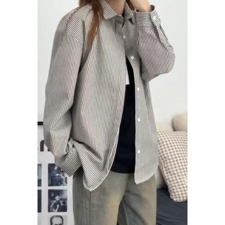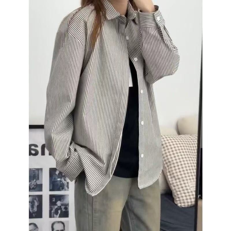 2025新款条纹长袖高品质衬衫女休闲打底衫宽松学院风情侣外套