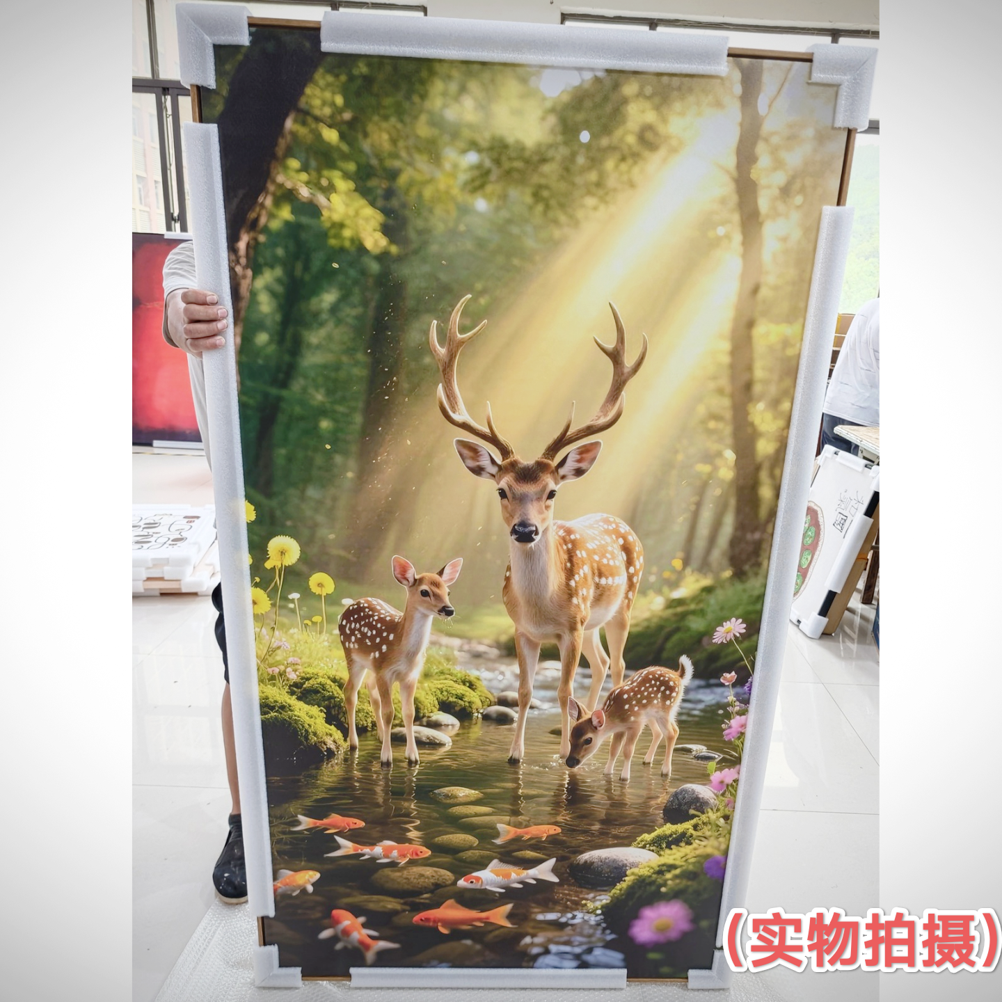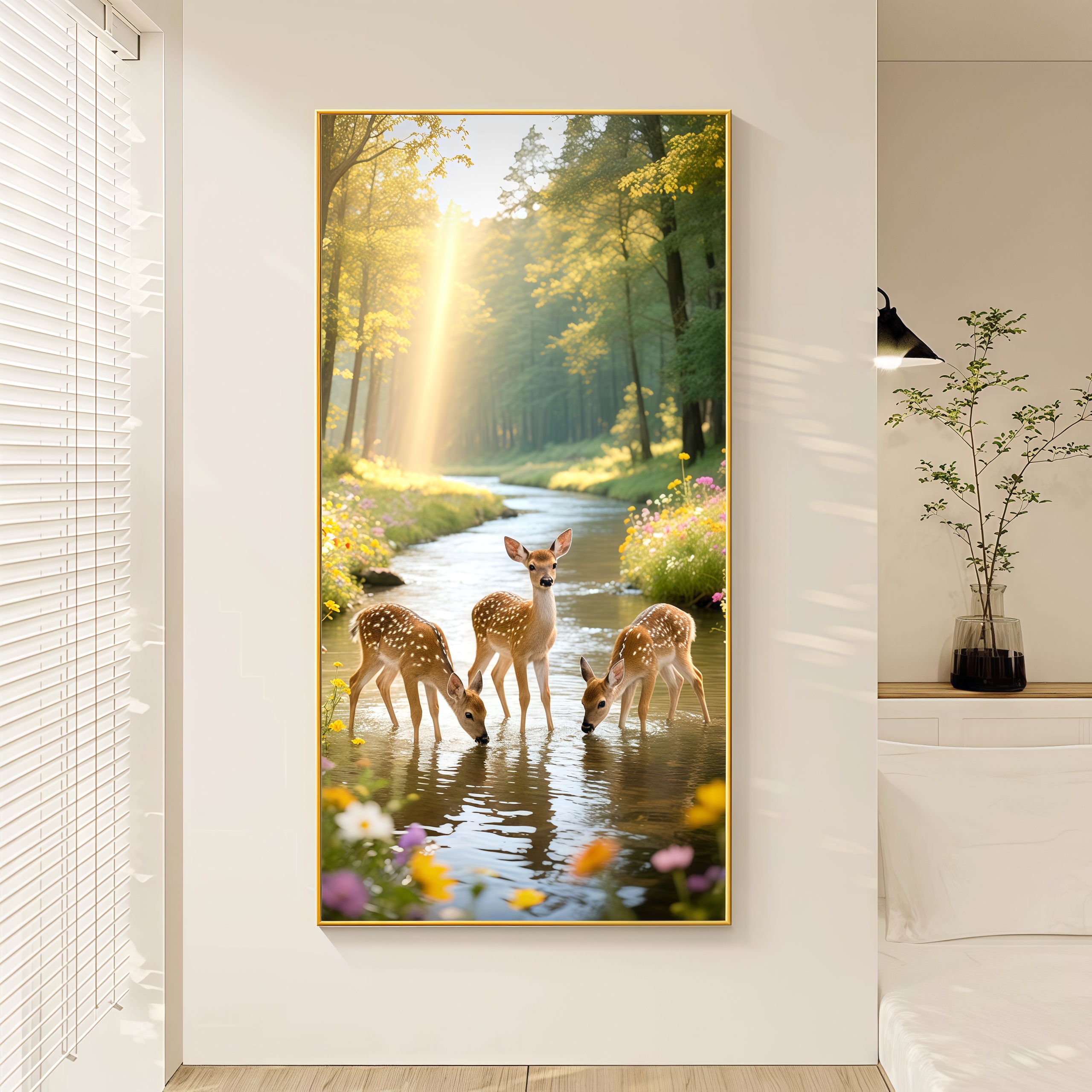 小鹿饮水画玄关鹿挂画竖版办公室装饰画五行喜水木森林客厅风景画