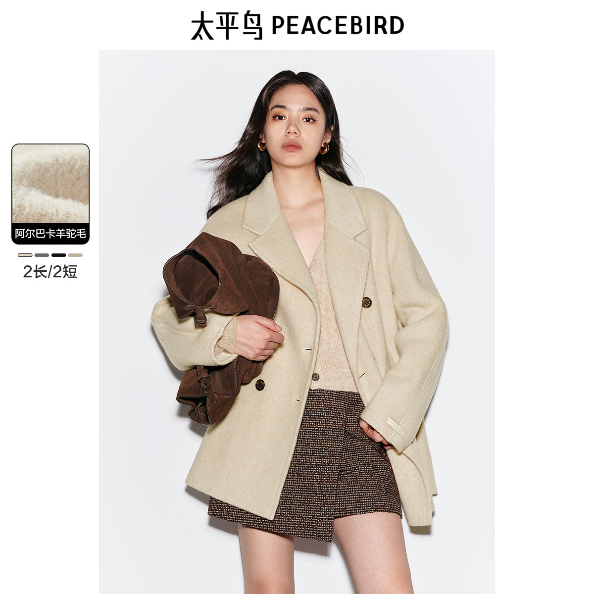 太平鸟女装25冬新款大师甄绒系列阿尔巴卡羊驼毛呢大衣双面呢外套