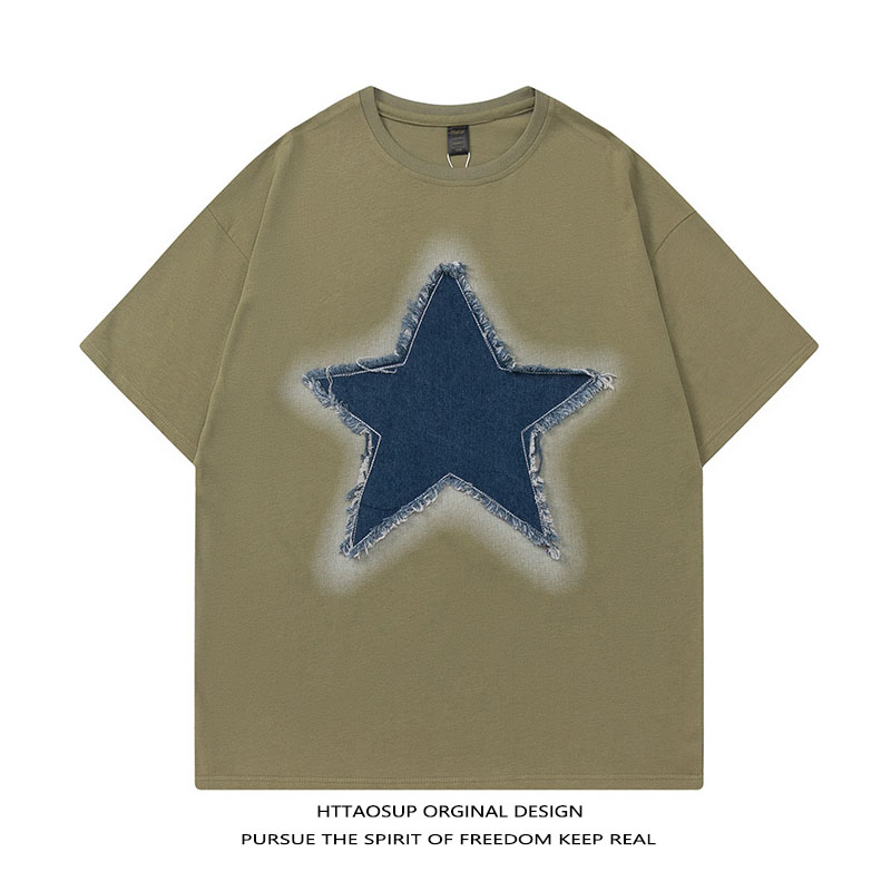 HTTAOSUP美式复古牛仔贴布星星短袖T恤男女宽松高街潮牌休闲体恤