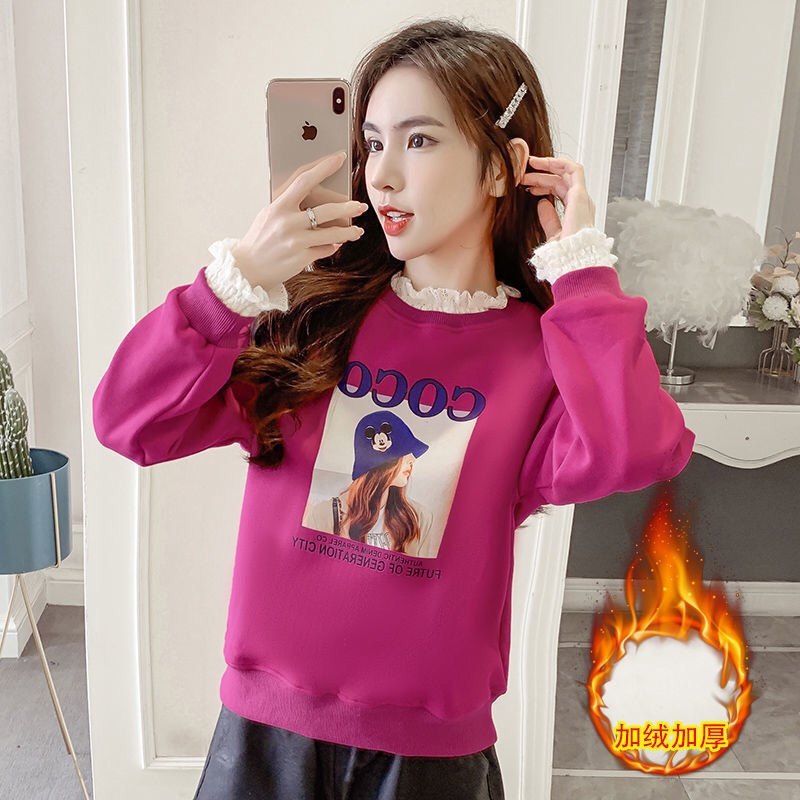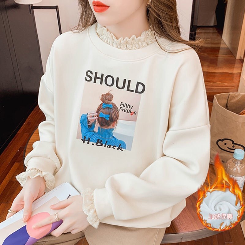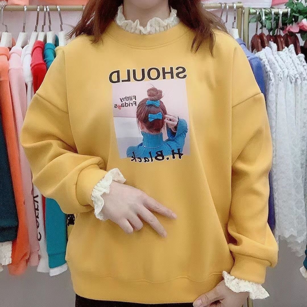 加绒加厚假两件卫衣女韩版半高领蕾丝拼接爆款宽松保暖套头上衣潮