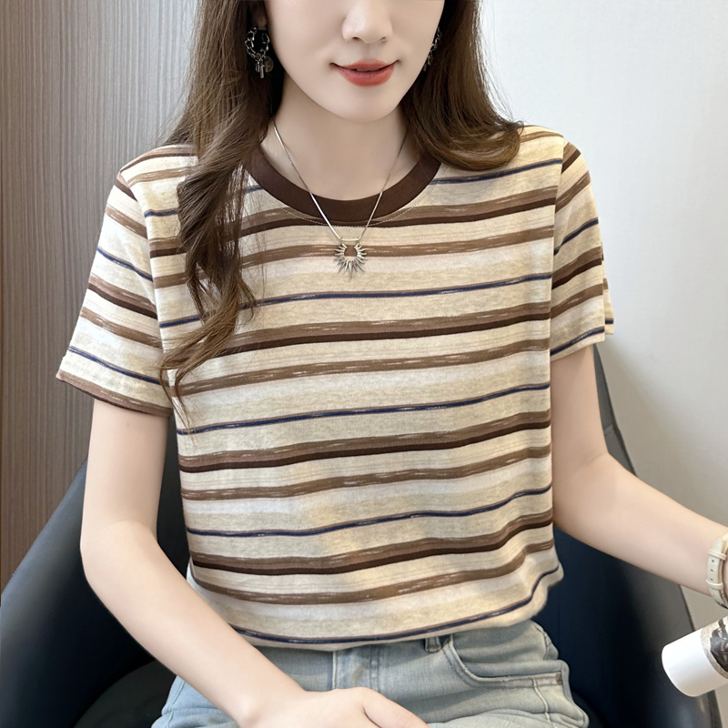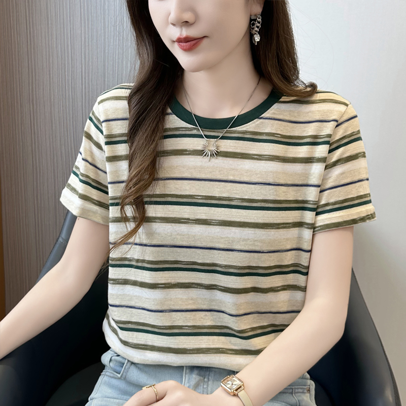 复古麻棉宽松条纹短袖T恤女2025新款夏季休闲简约百搭体恤衫上衣