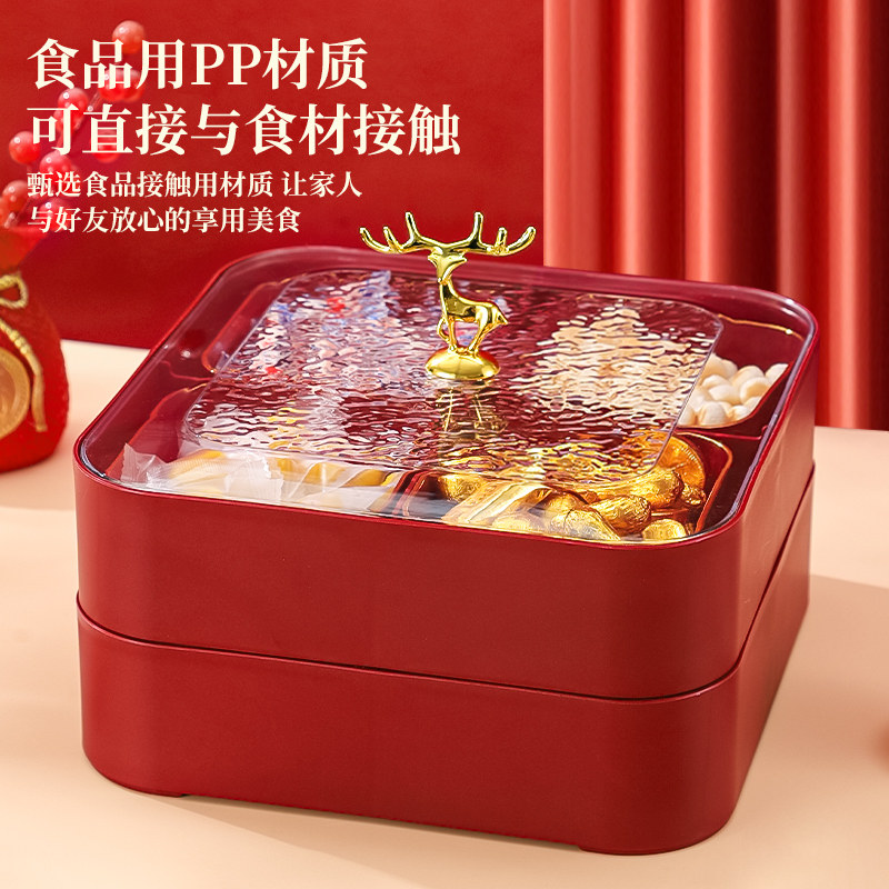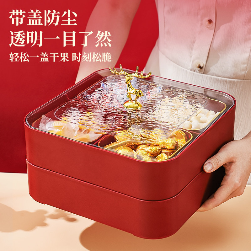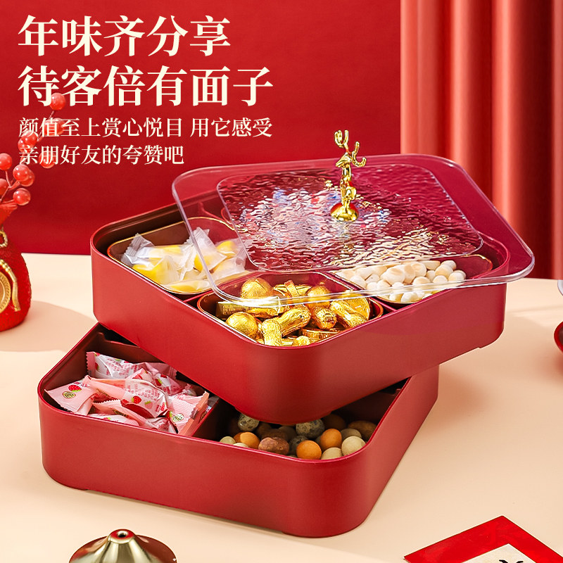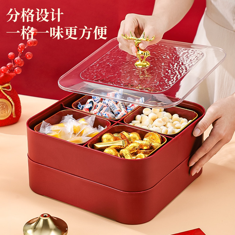 新中式红色喜庆分格糖果盒家用客厅干果盘新年结婚乔迁零食收纳盒
