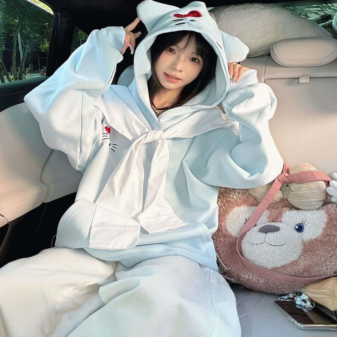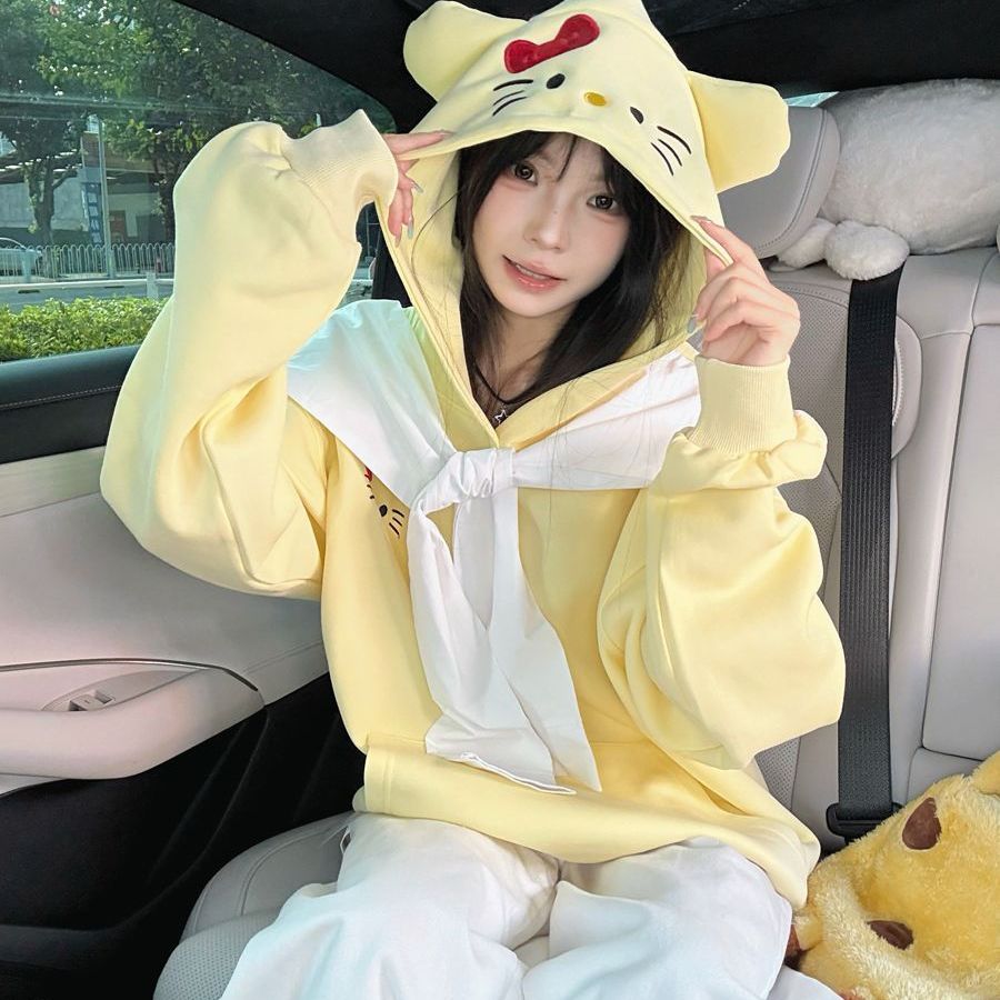 美式复古小猫刺绣连帽卫衣女春秋