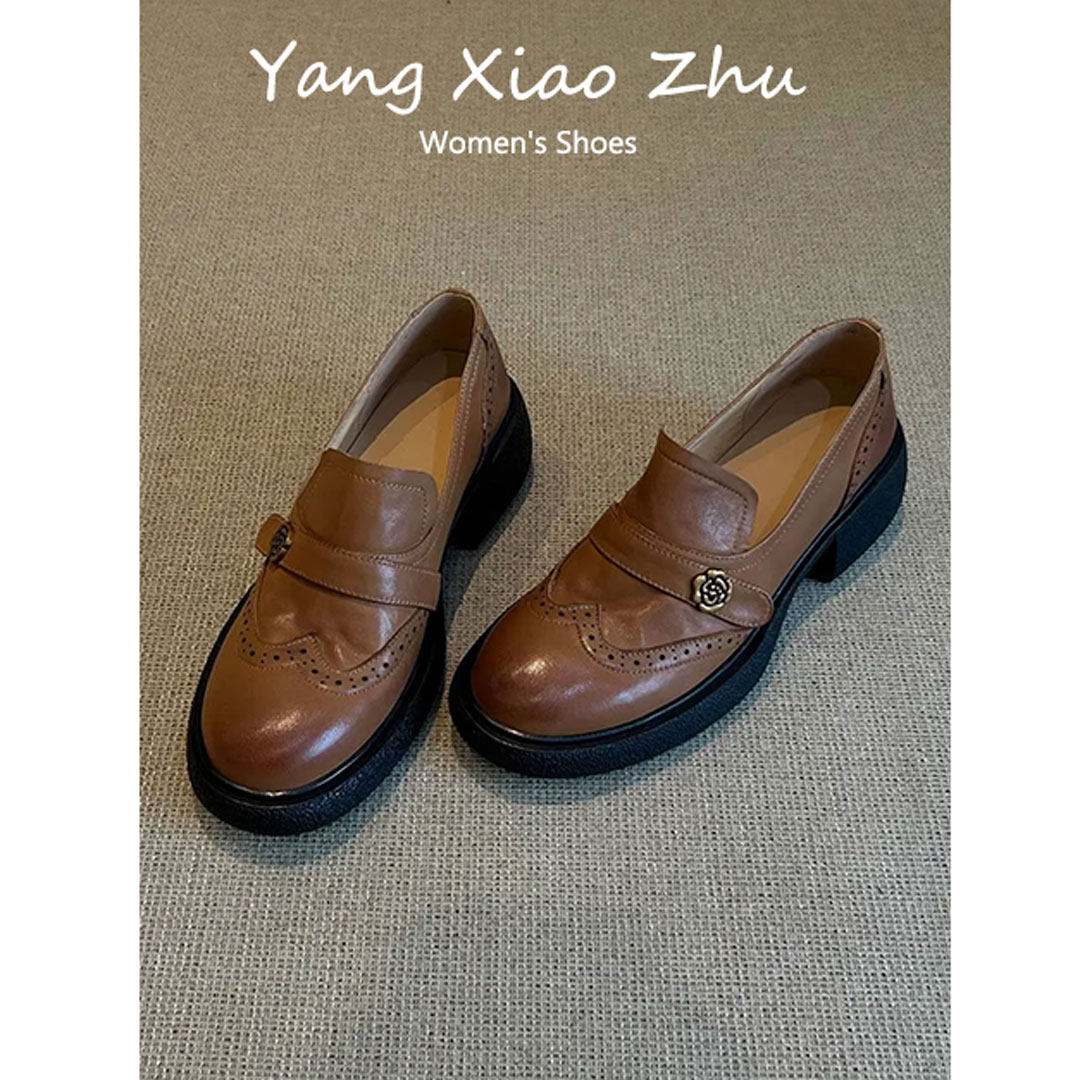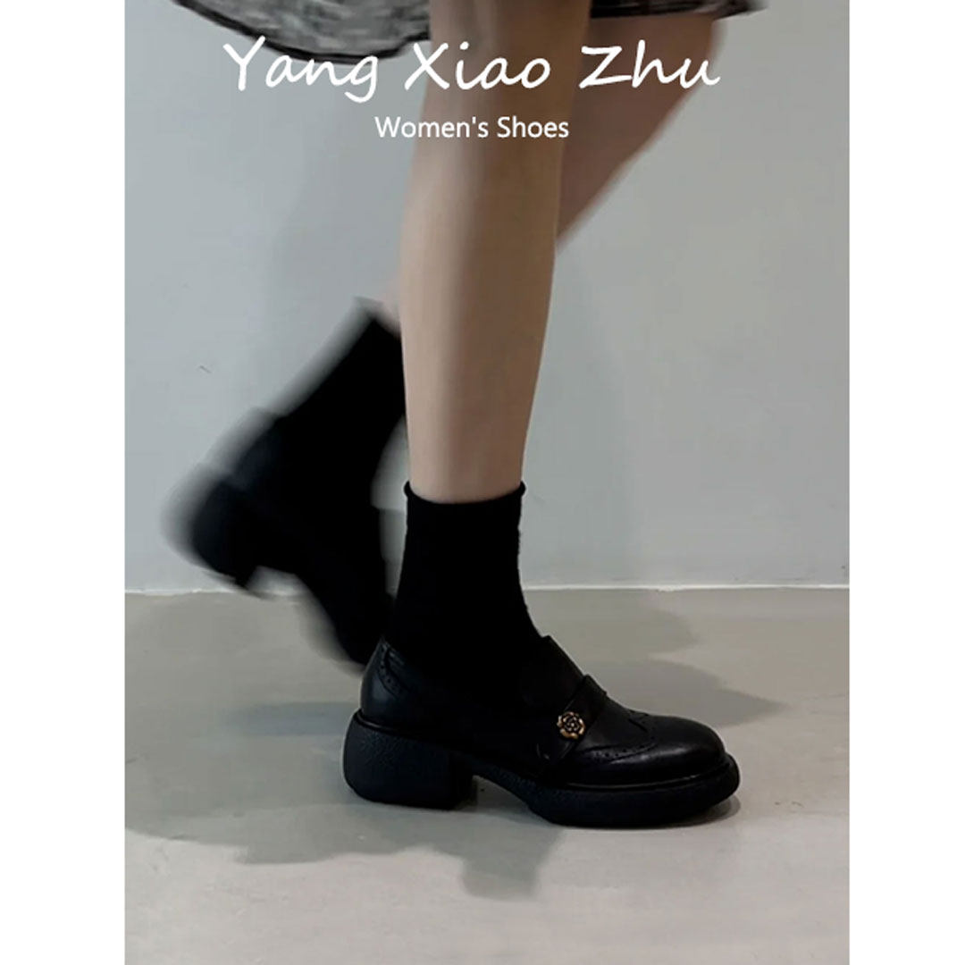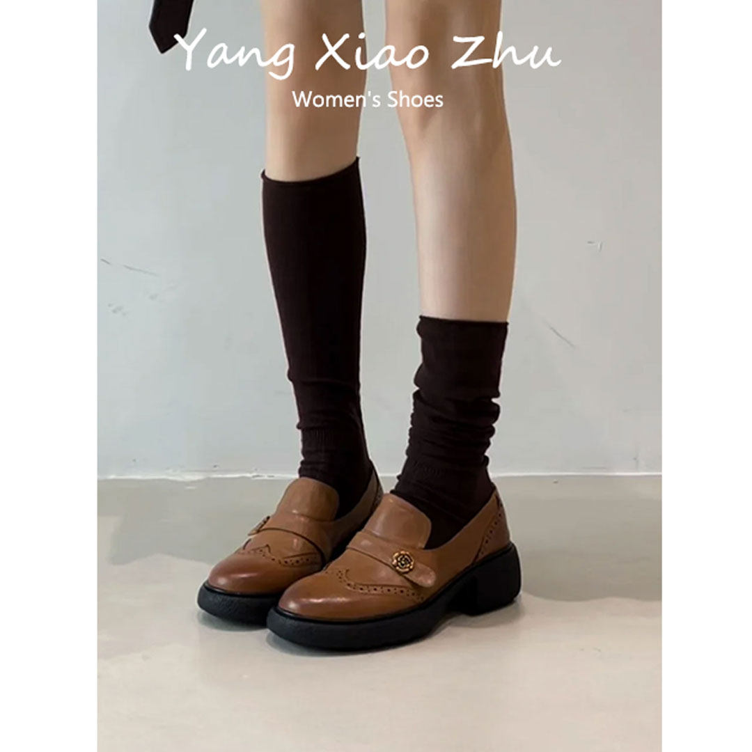 牛皮版~英伦风山茶花粗跟乐福鞋女一脚蹬圆头小皮鞋百搭通勤单鞋