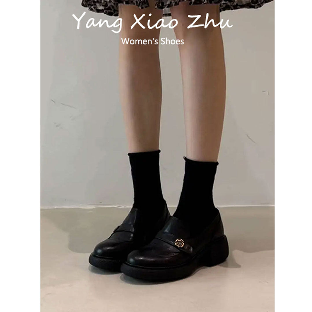 牛皮版~英伦风山茶花粗跟乐福鞋