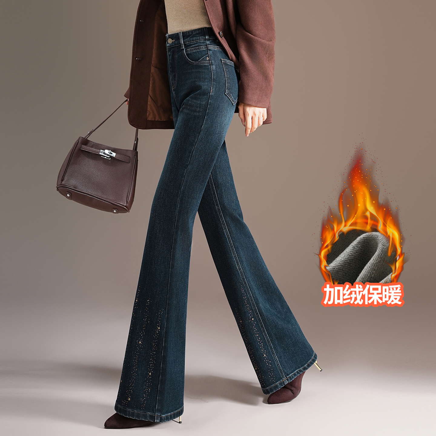 烫钻薄绒微喇牛仔裤女冬季新款大码长裤高腰弹力修身显瘦喇叭裤