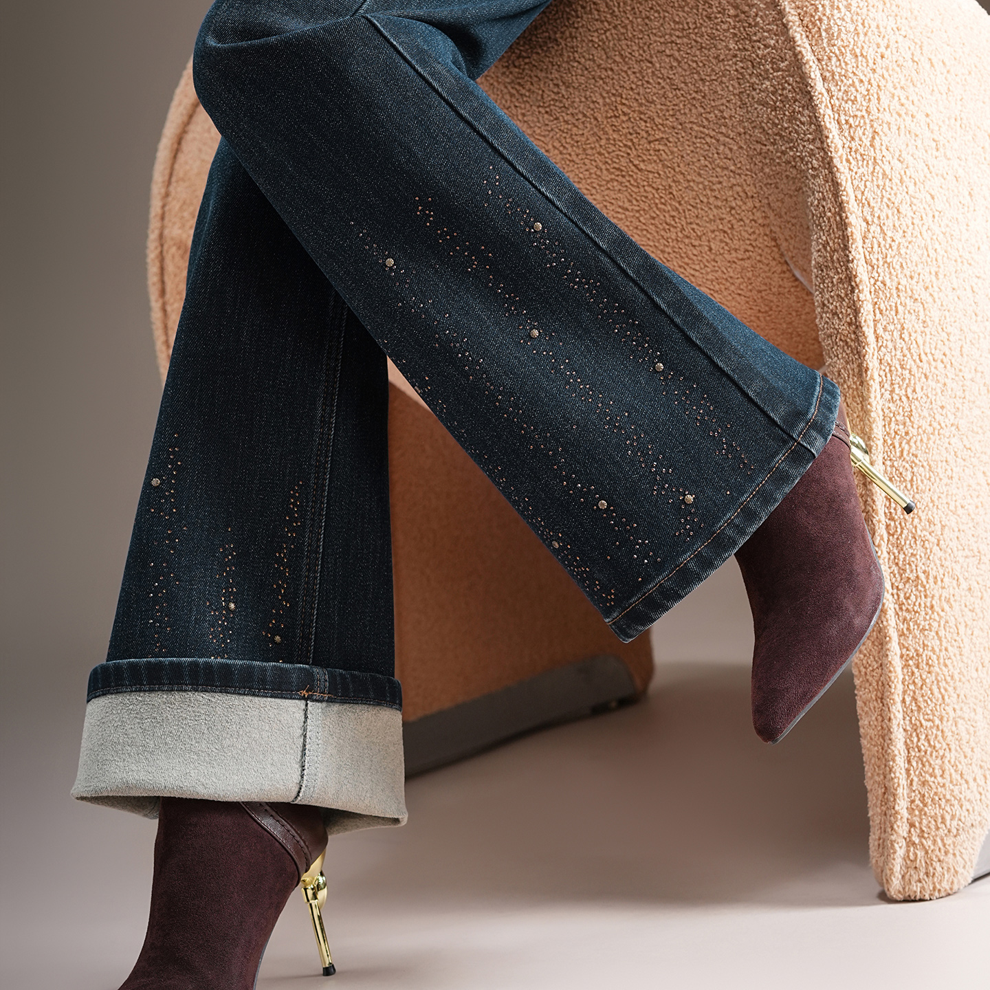 烫钻微喇叭裤女冬款薄绒牛仔裤