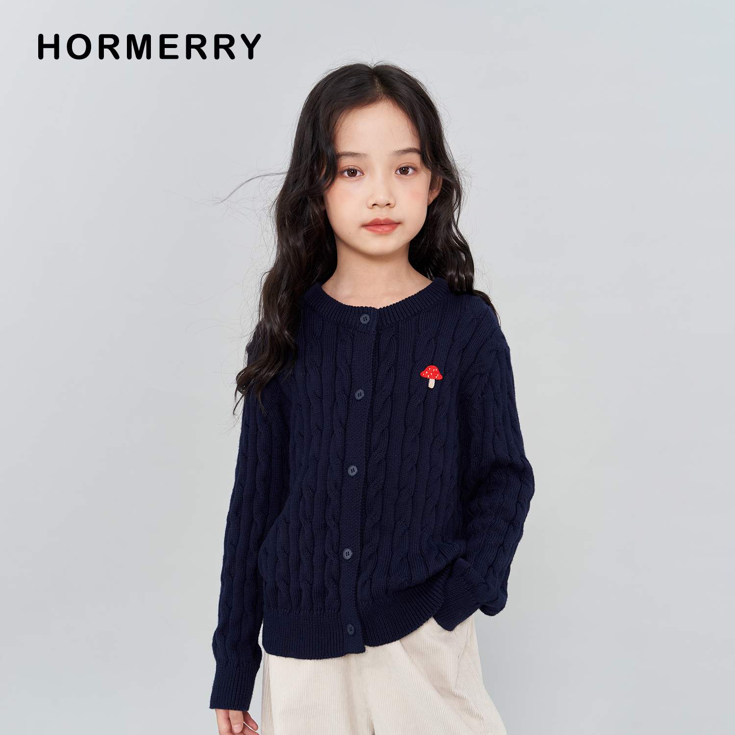 赫米童装2025秋冬新款女童蘑菇刺绣麻花羊毛毛衣开衫学院风针织衫