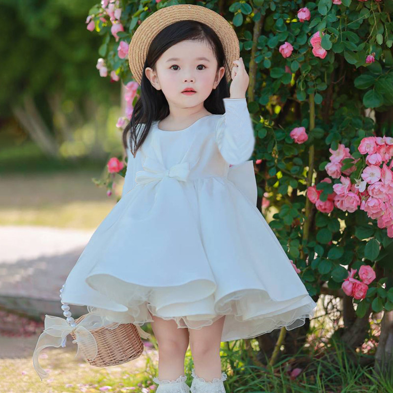 儿童长袖生日礼服花童婚礼小女孩婚纱公主裙缎面花嫁蓬蓬连衣裙子