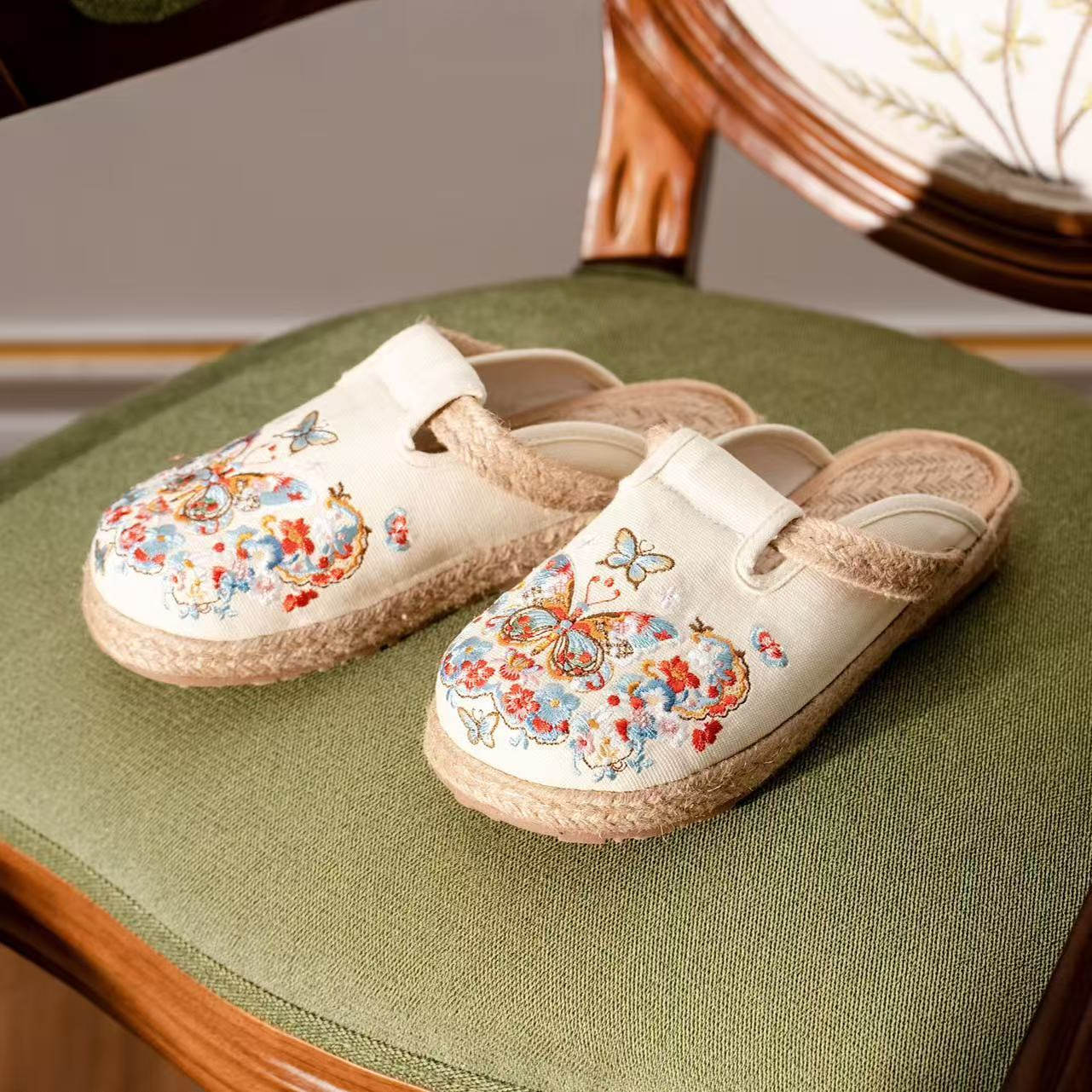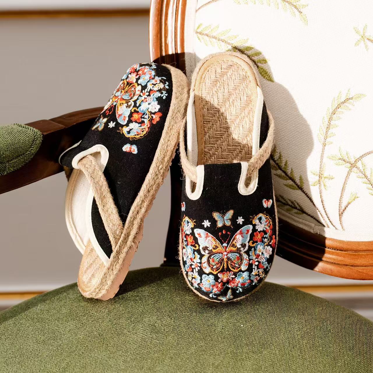 {戏蝶}2025新款复古民族风休闲平底拖鞋布鞋牛筋底棉麻绣花拖鞋
