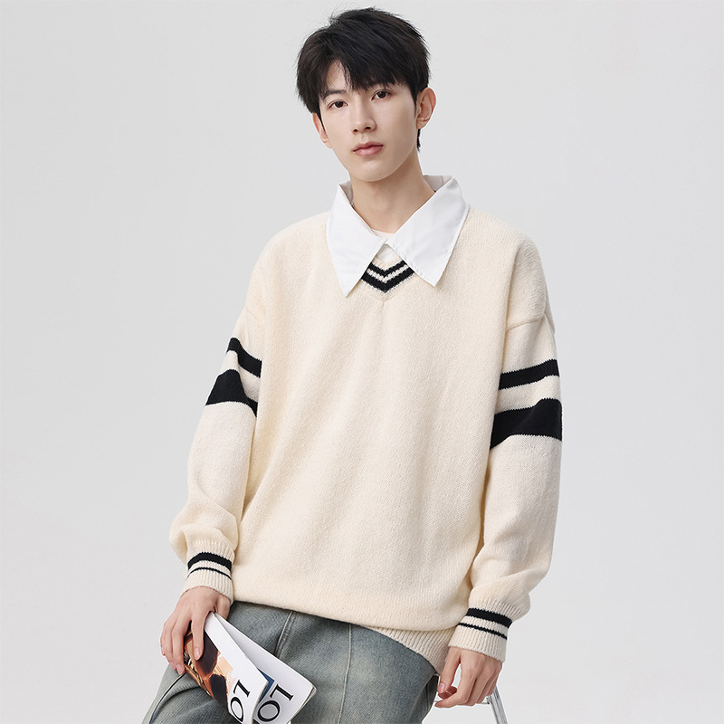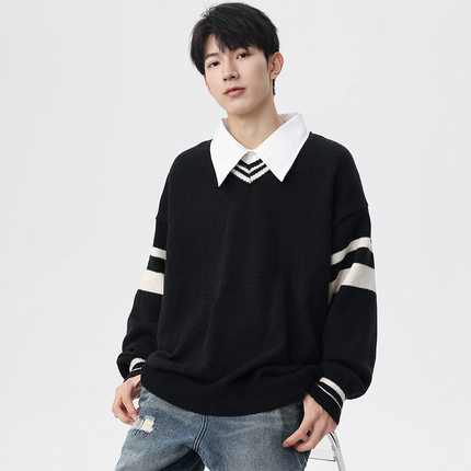 毛衣男装假两件针织衫秋冬新款长袖百搭宽松衬衫领拼色V领上衣女