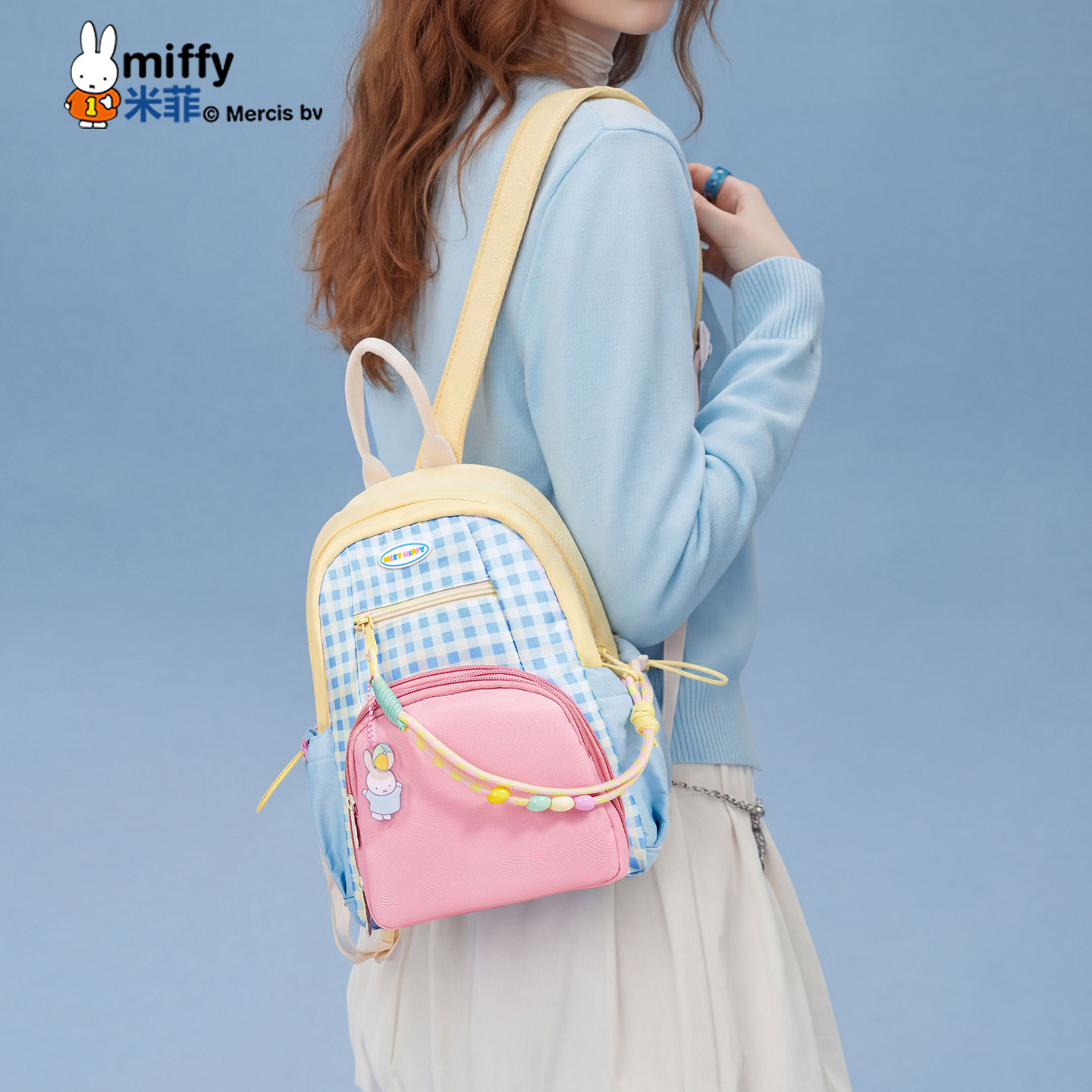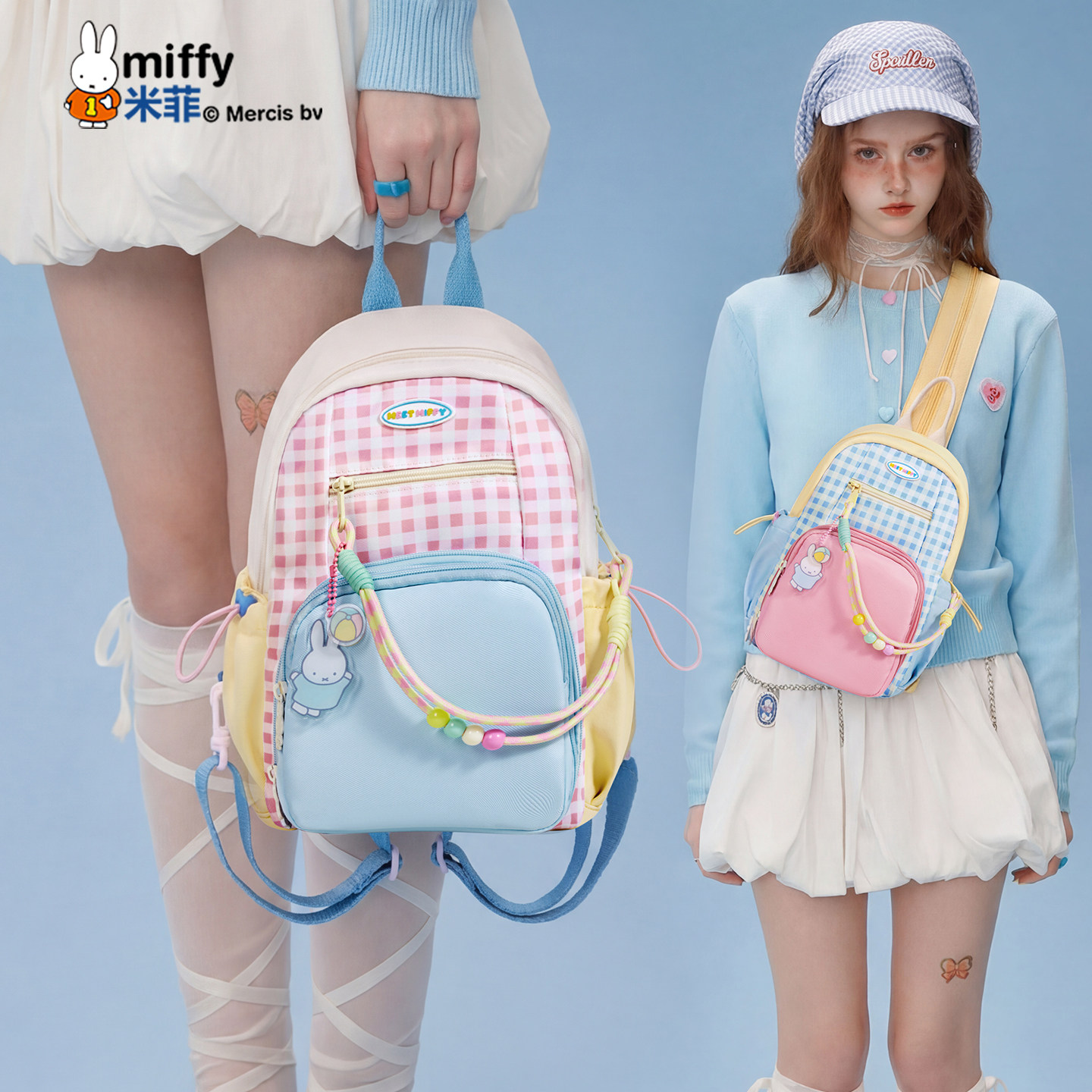米菲格子撞色双肩包痛包可爱儿童轻便背包学生校园书包斜挎包胸包