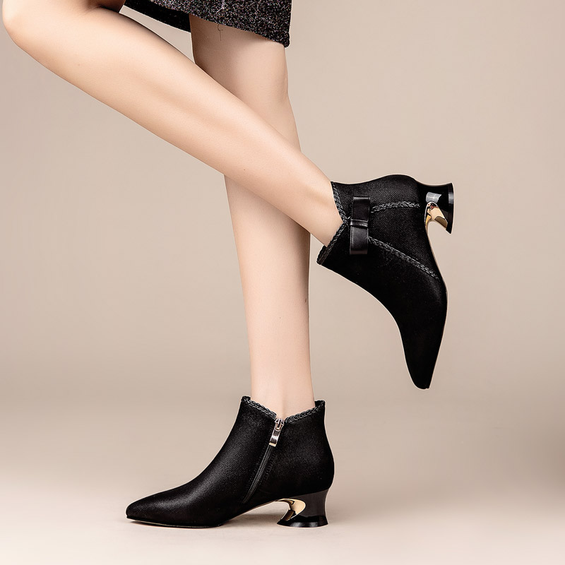 真皮小短靴女秋冬季新款尖头粗跟加绒及踝靴中跟短筒单靴裸靴女靴