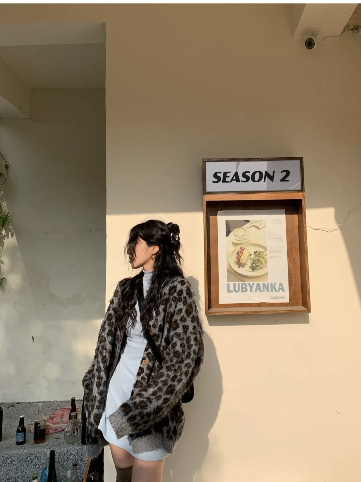复古豹纹保暖毛衣外套女2024秋冬新款韩版慵懒风宽松小众针织开衫