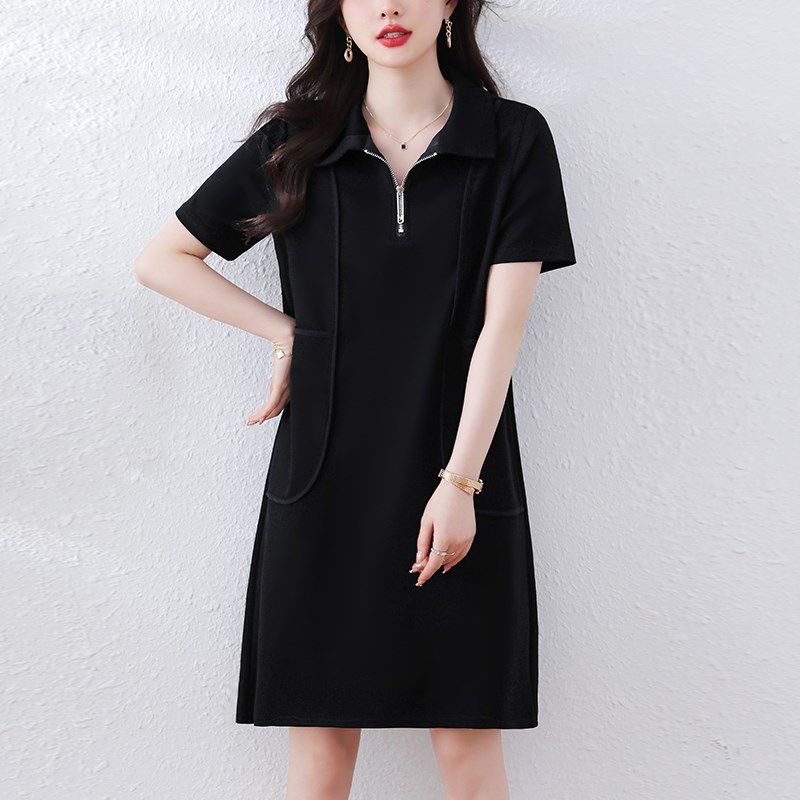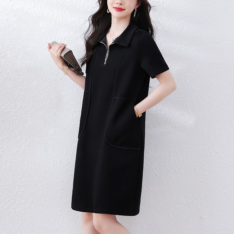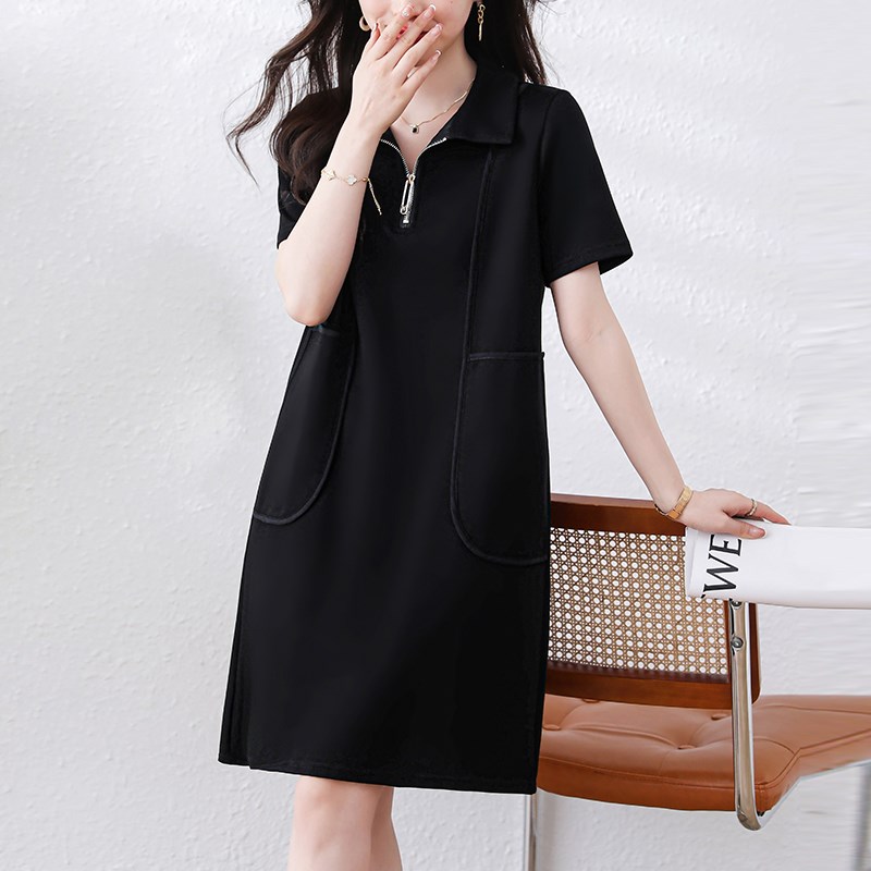 大码宽松拉链翻领连衣裙女夏季新款黑色休闲显瘦短袖中长裙