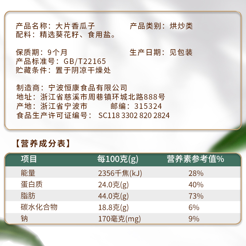 恒康食品 大片瓜子105g*5袋 原味大颗粒葵花籽小包装零食炒货批发