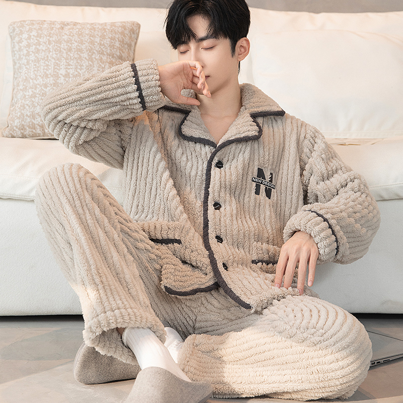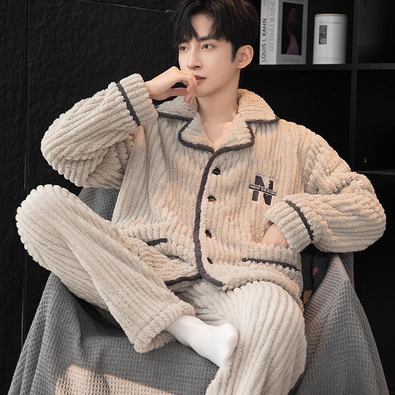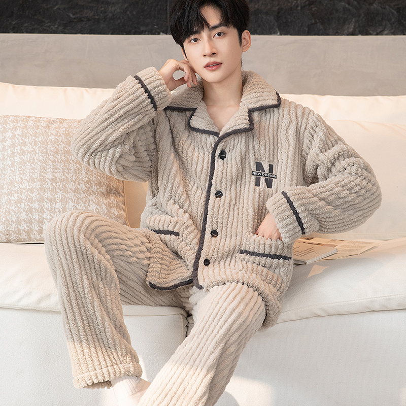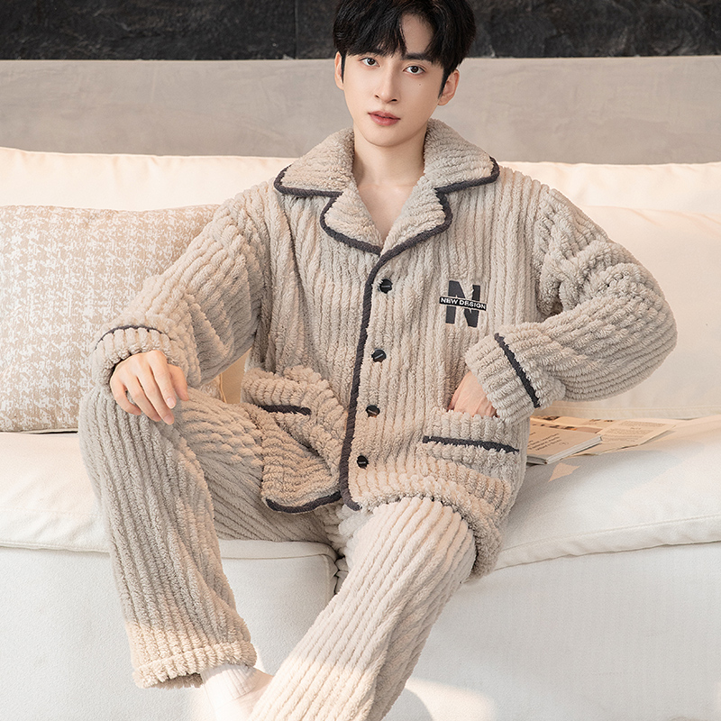 秋冬款男士睡衣秋冬季加绒加厚字母休闲韩版大码保暖家居服套装