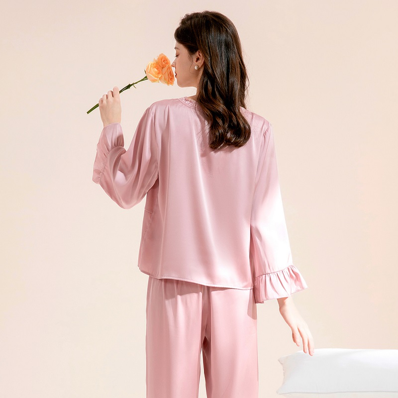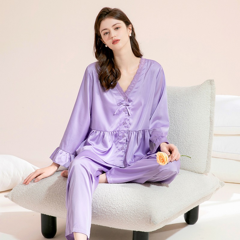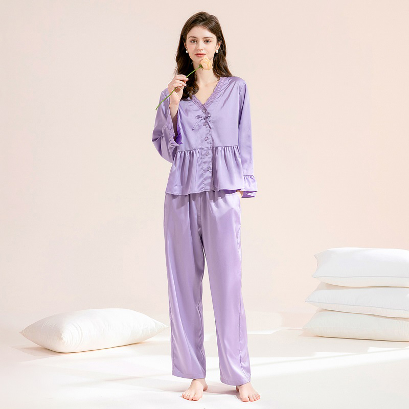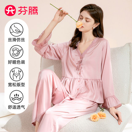 芬腾夏季新款轻柔顺滑女士家居服套装裸感舒适仿丝蕾丝V领薄睡衣