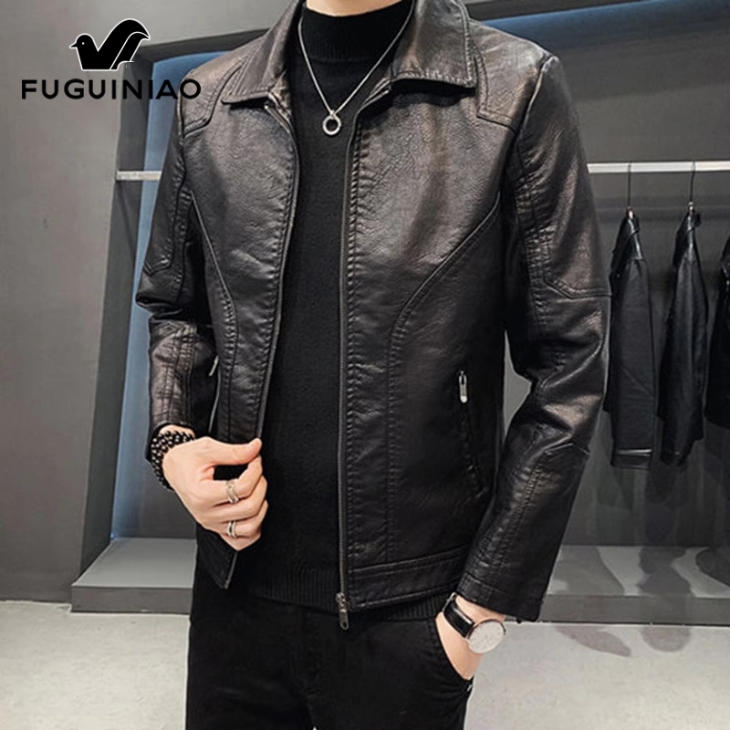 富贵鸟翻领皮衣男士黑色机车服2025年秋季新款休闲皮夹克外套男装