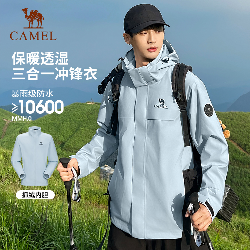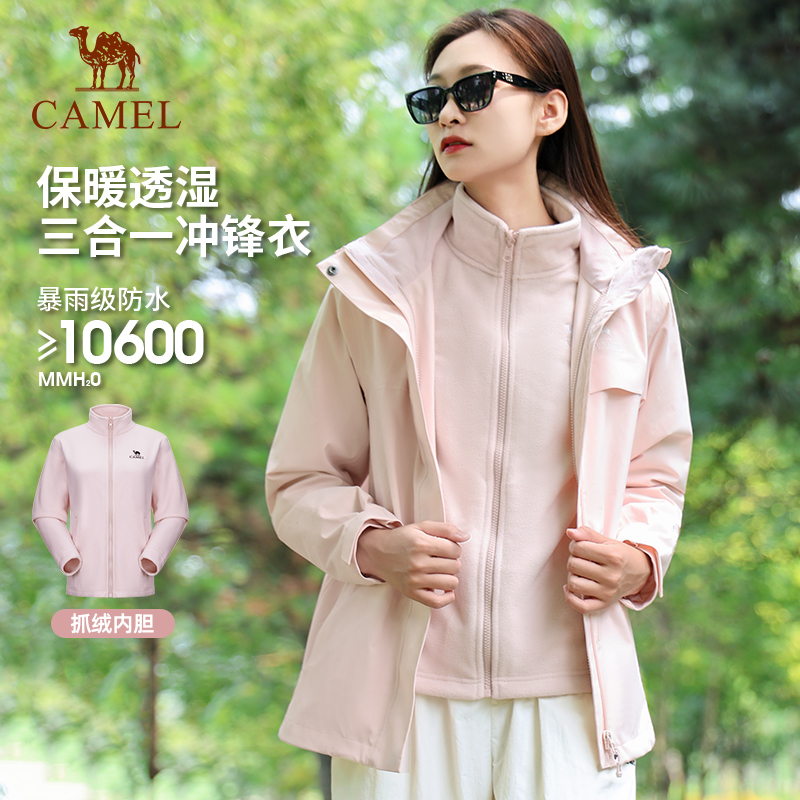 骆驼绯影红冲锋衣女户外25年三合一可拆卸抓绒内胆防水登山外套男