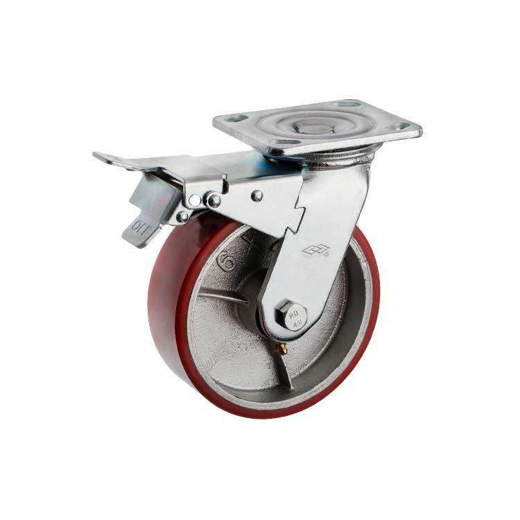 4寸5寸6寸8寸铸铁芯PU轮中重型红色聚氨酯脚轮万向轮子静音带刹车