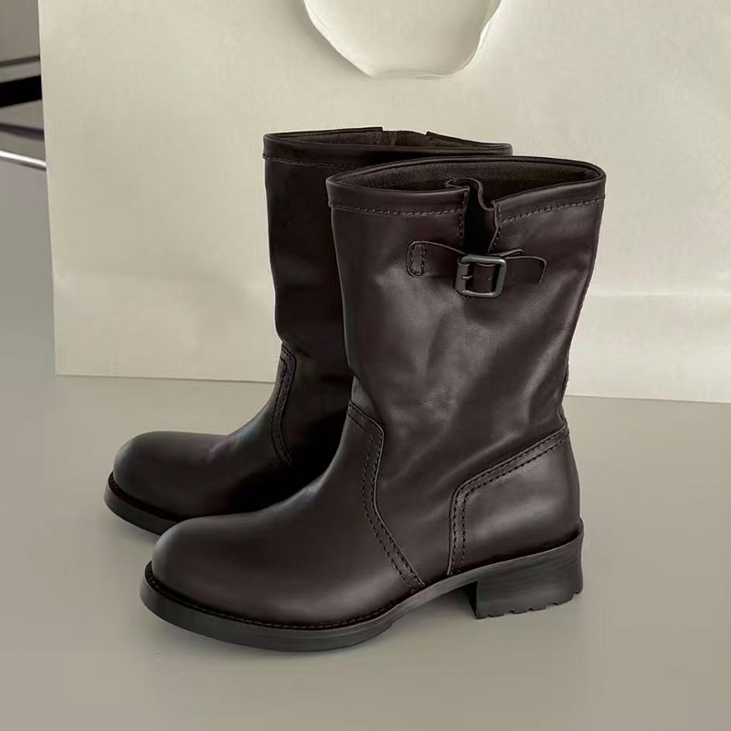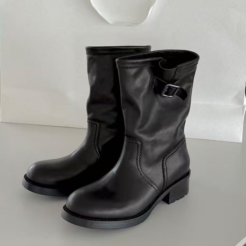 诗歌兰真皮厚底皮带扣中筒骑士靴