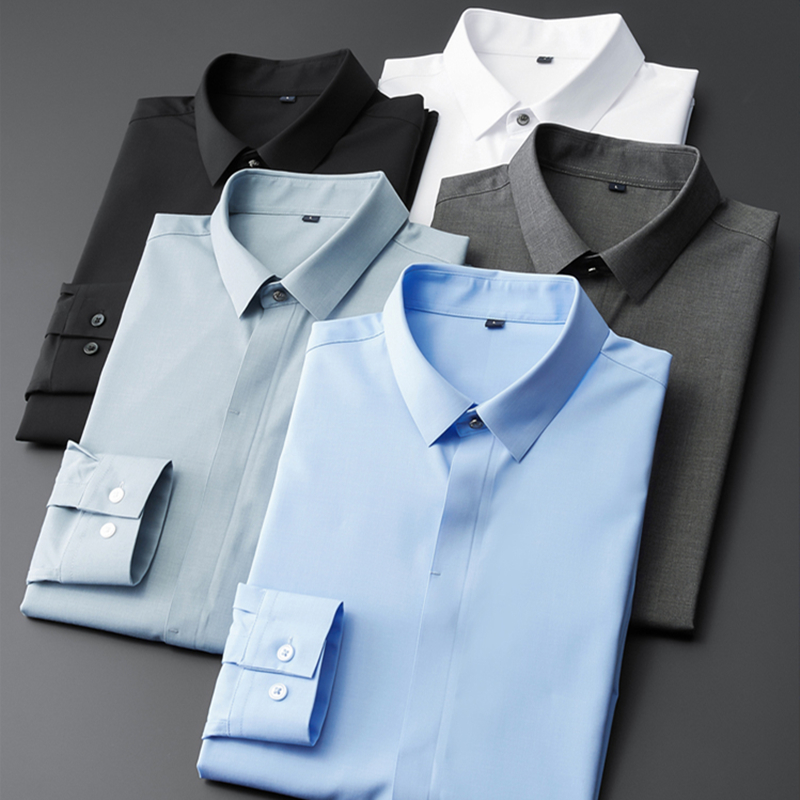 衬衫男长袖暗门襟纯色秋季免烫抗皱衬衣青年修身潮流暗扣纯黑寸衫
