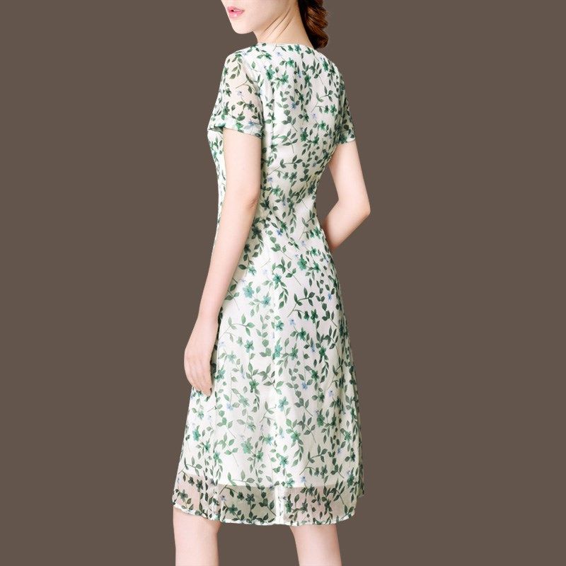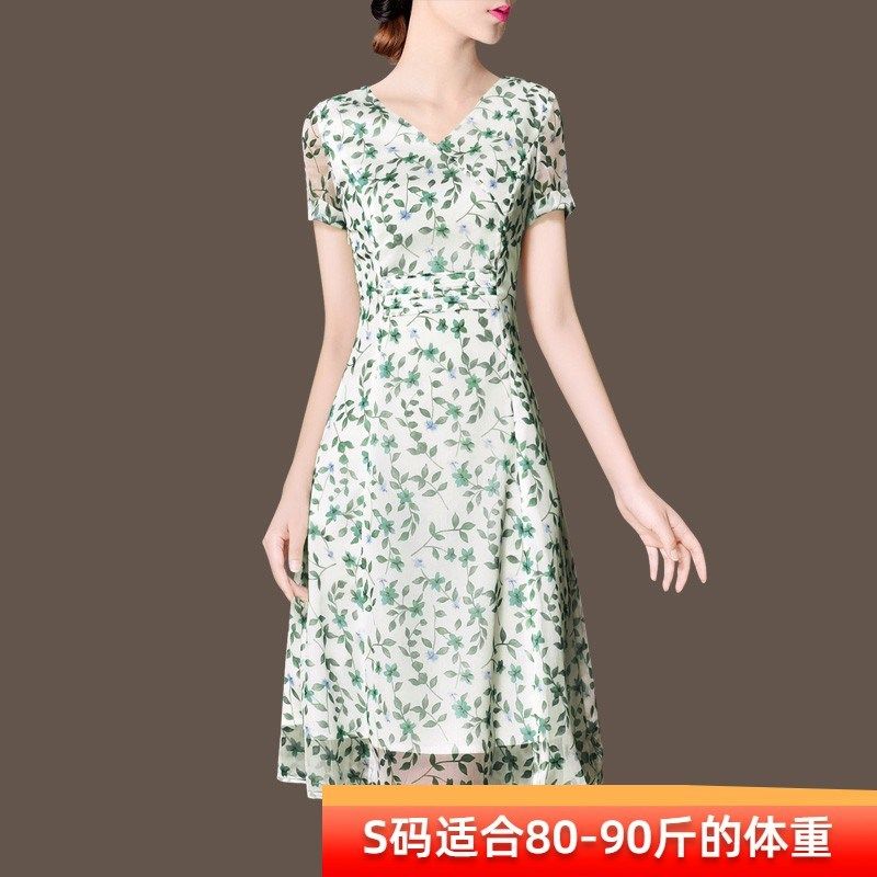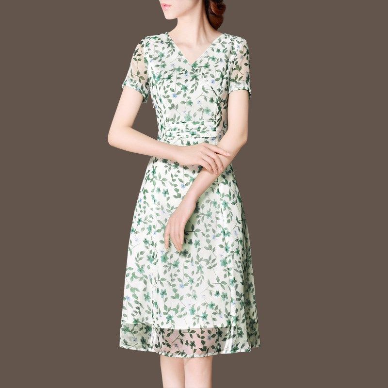 2025夏装新款女装 V领修身显瘦褶皱收腰 印花a摆连衣裙中长款