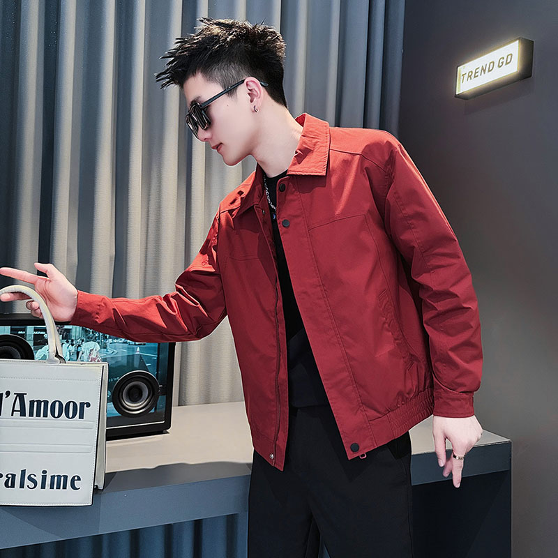 痞帅夹克男士修身流行红色上衣2025新款爆款纯色本面年超好看外套